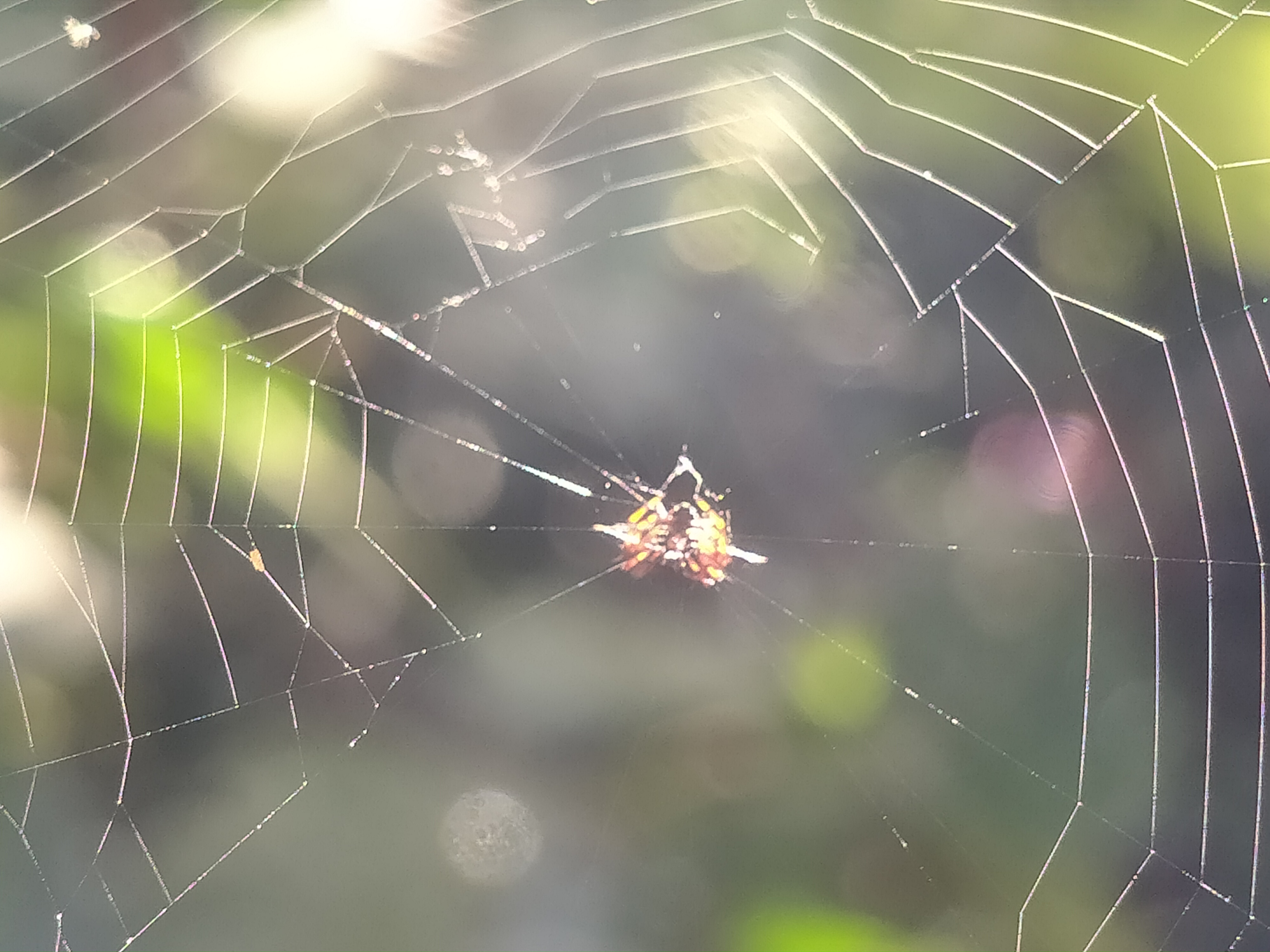 Seekor laba-laba kecil bergelantungan di jaring.