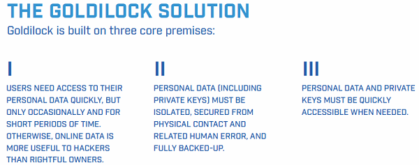 GOLDILOCK combines the features of both cold and hot storage and a set of digital elements to protect the cryptocurrencies and specific digital assets to be used by individuals and institutions. It is online when you need it and offline when you don't. What better security system could you possibly ask for?