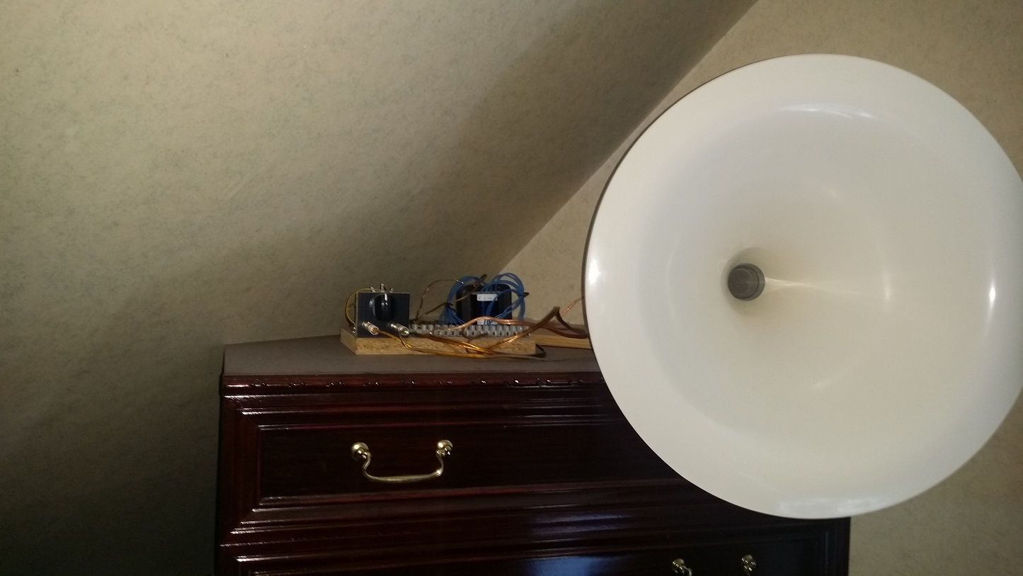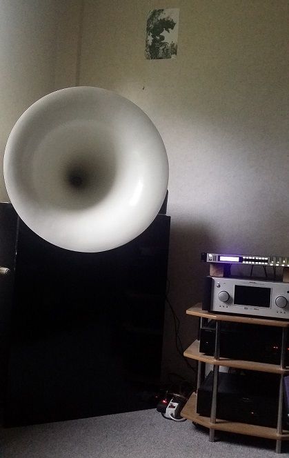 Sie haben ein etwas kleineres Kugelwellenhorn mit 53 cm spendiert bekommen. Man sieht auch noch meine selbst gebaute passive Weiche für die Frequenztrennung mit verlustarmem Autotrafo.