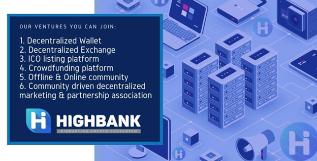 HIGHBANK creates the next generation blockchain-based ecosystem, which is needed to allow the cryptocurrency community to maximize and diversify their portfolios in the volatile cryptography market. Highbank is changing the basis of the cryptocurrency market, creating a trading ecosystem that can increase the spread of cryptocurrency. Our platform, which will be built on the Ethereum blockchain, will become a full-fledged crypto-trading platform with a decentralized crypto-exchange, ICO List, ICO Launch and Crowdfunding, marketing and partner programs, online and offline centers, as well as Blockchain consultations.
