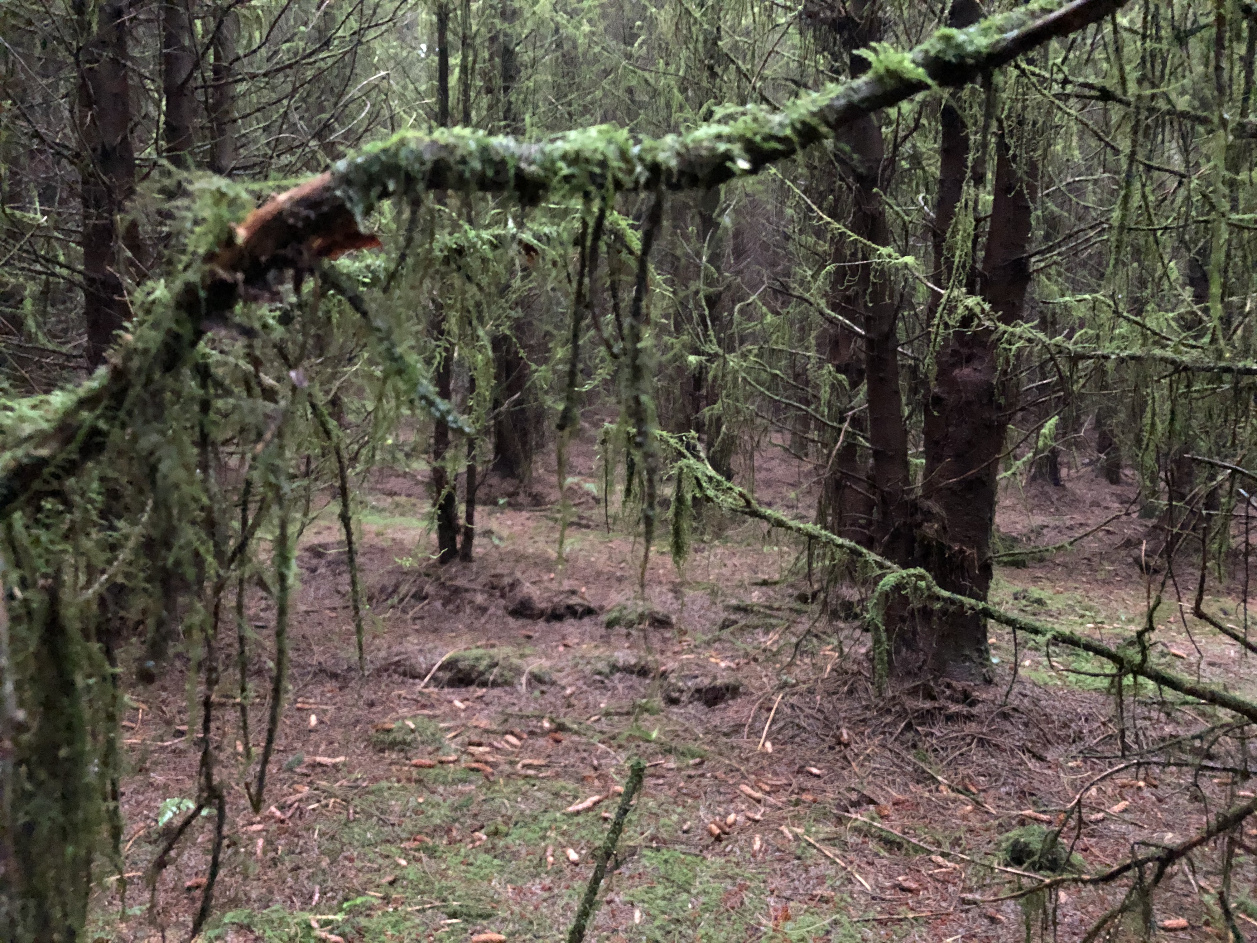 The trees surrounding the old house must be exempt from the chainsaw and look a lot older than the ones in the forestry area. Draped in lichen and moss, they give a Blair Witch feel to already creepy part of the trail.