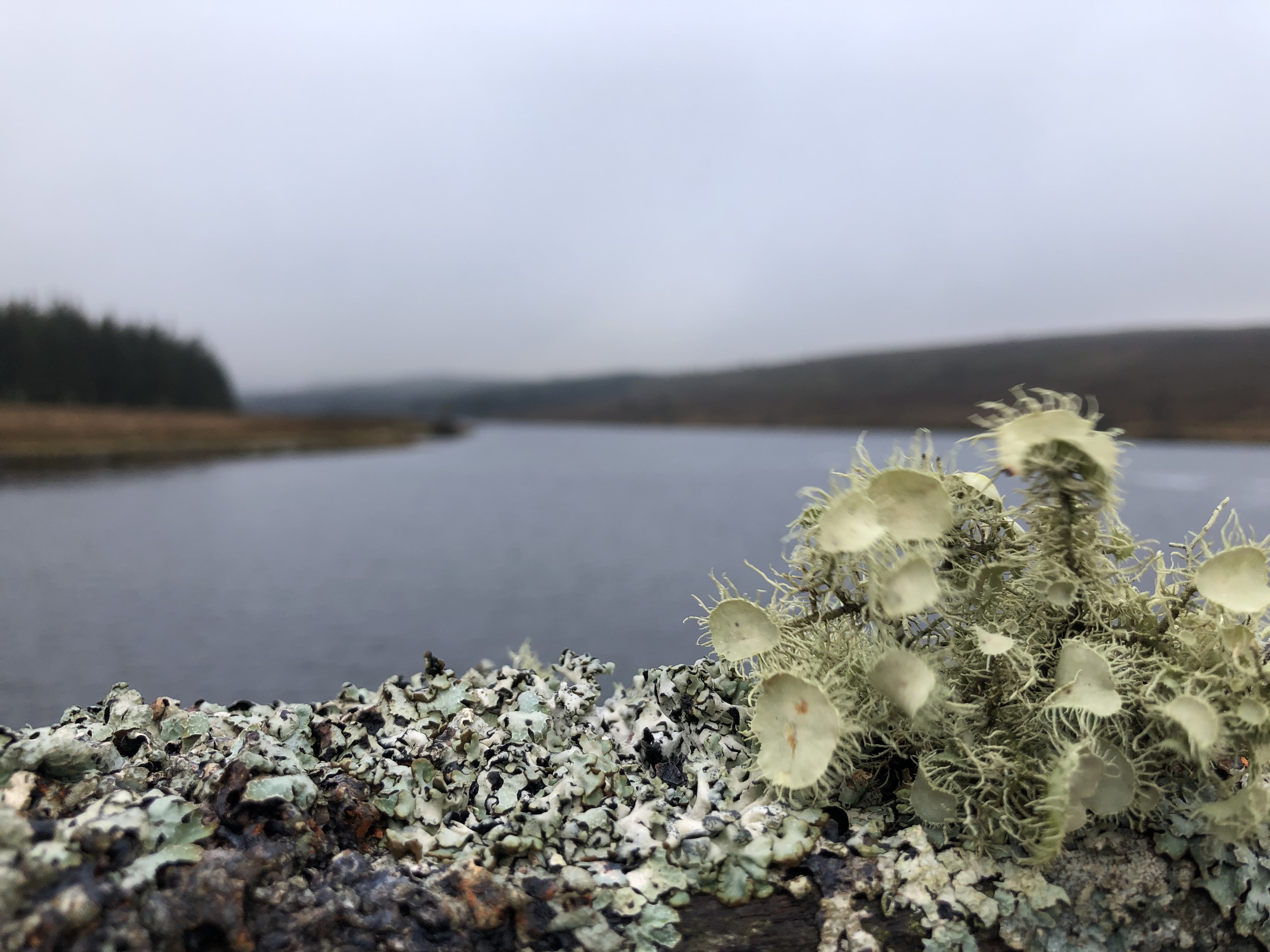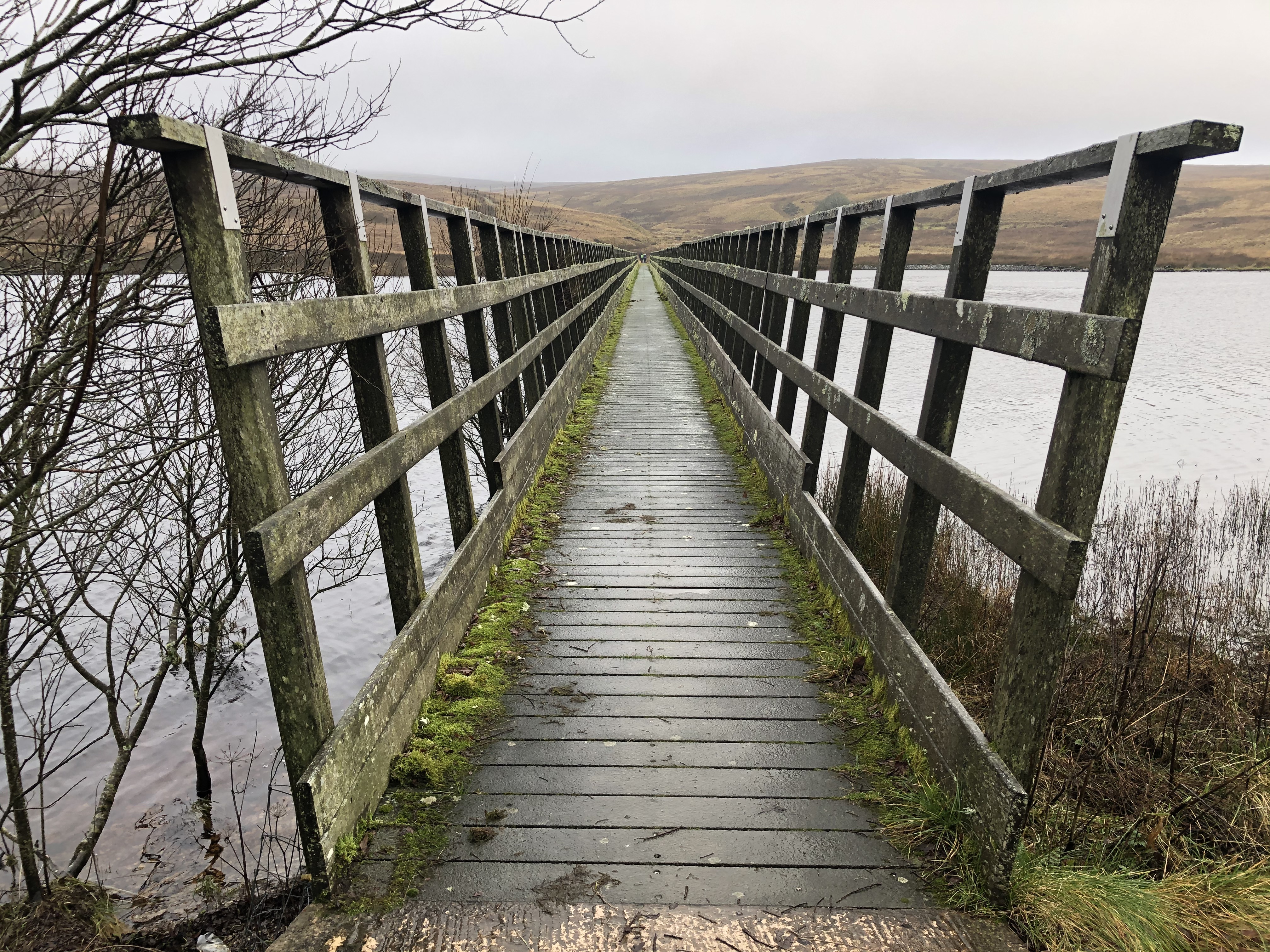 Leaving the old house behind and rejoining the narrow track we crossed a narrow part of the reservoir over a rickety wooden bridge. At this time of year the wood of the bridge is infested with lichen and it makes for an interesting walk through a pale green, windy passageway.