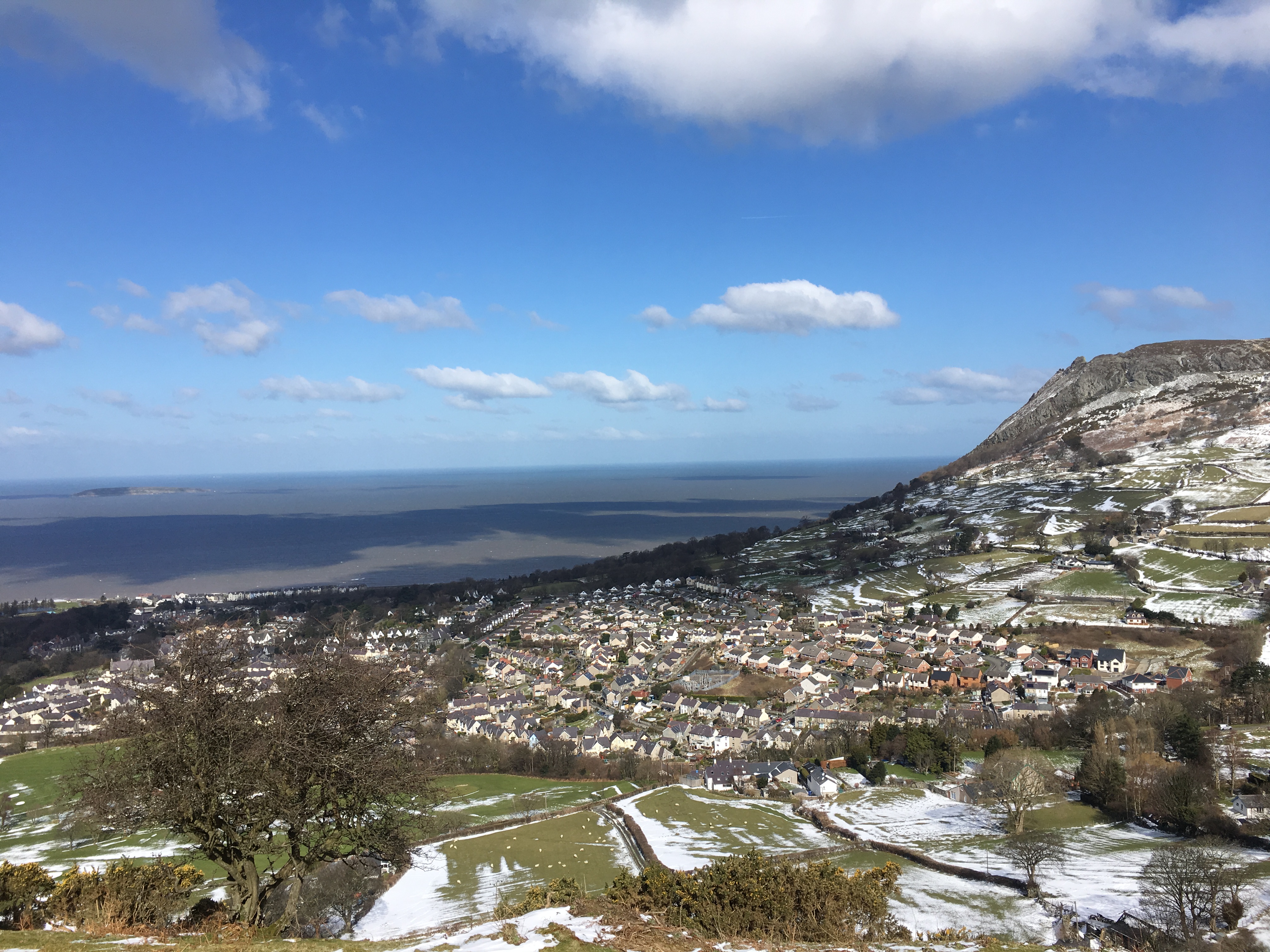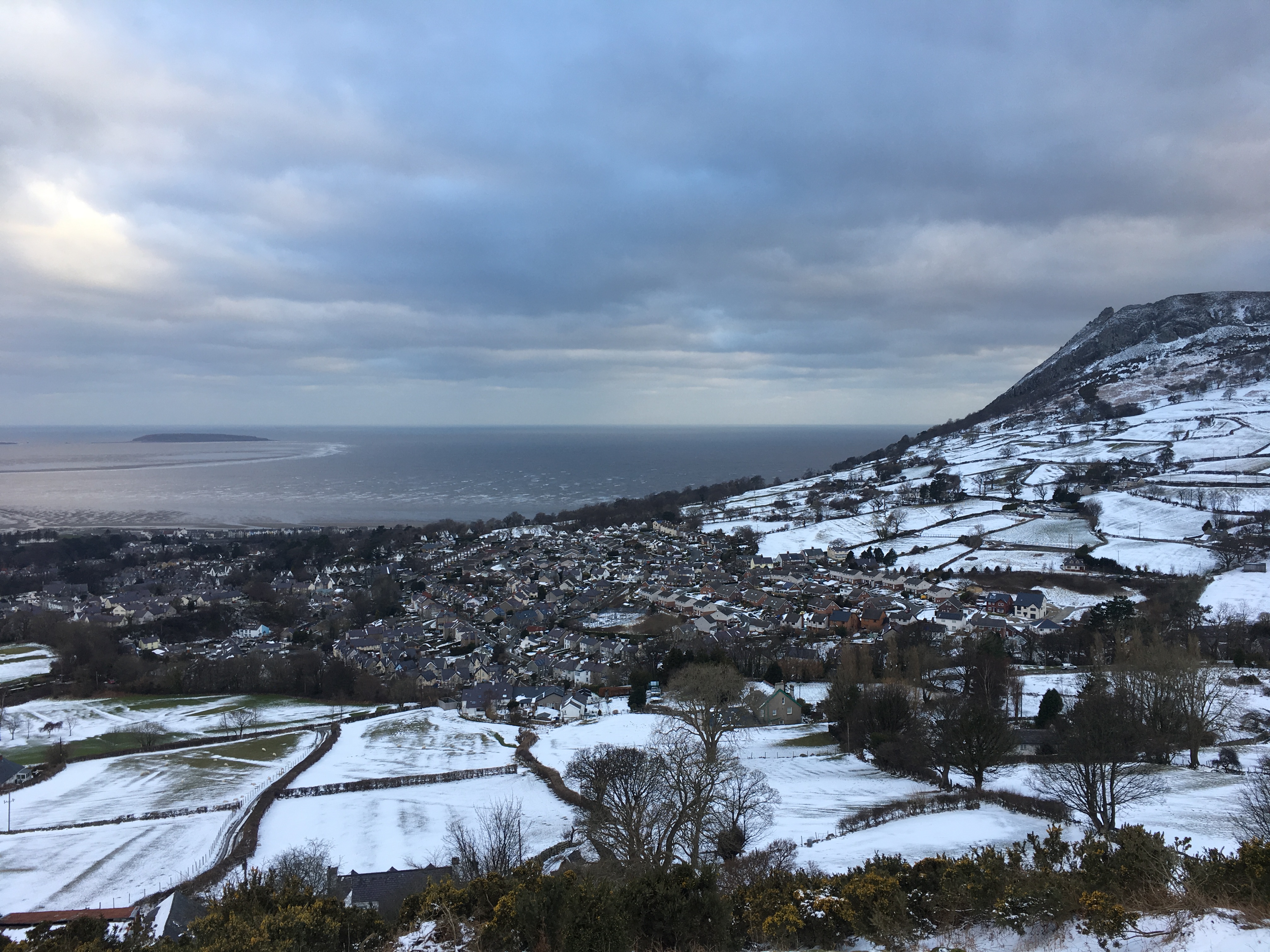 Looking back at a frozen Llanfairfechan with Puffin island in the distance.