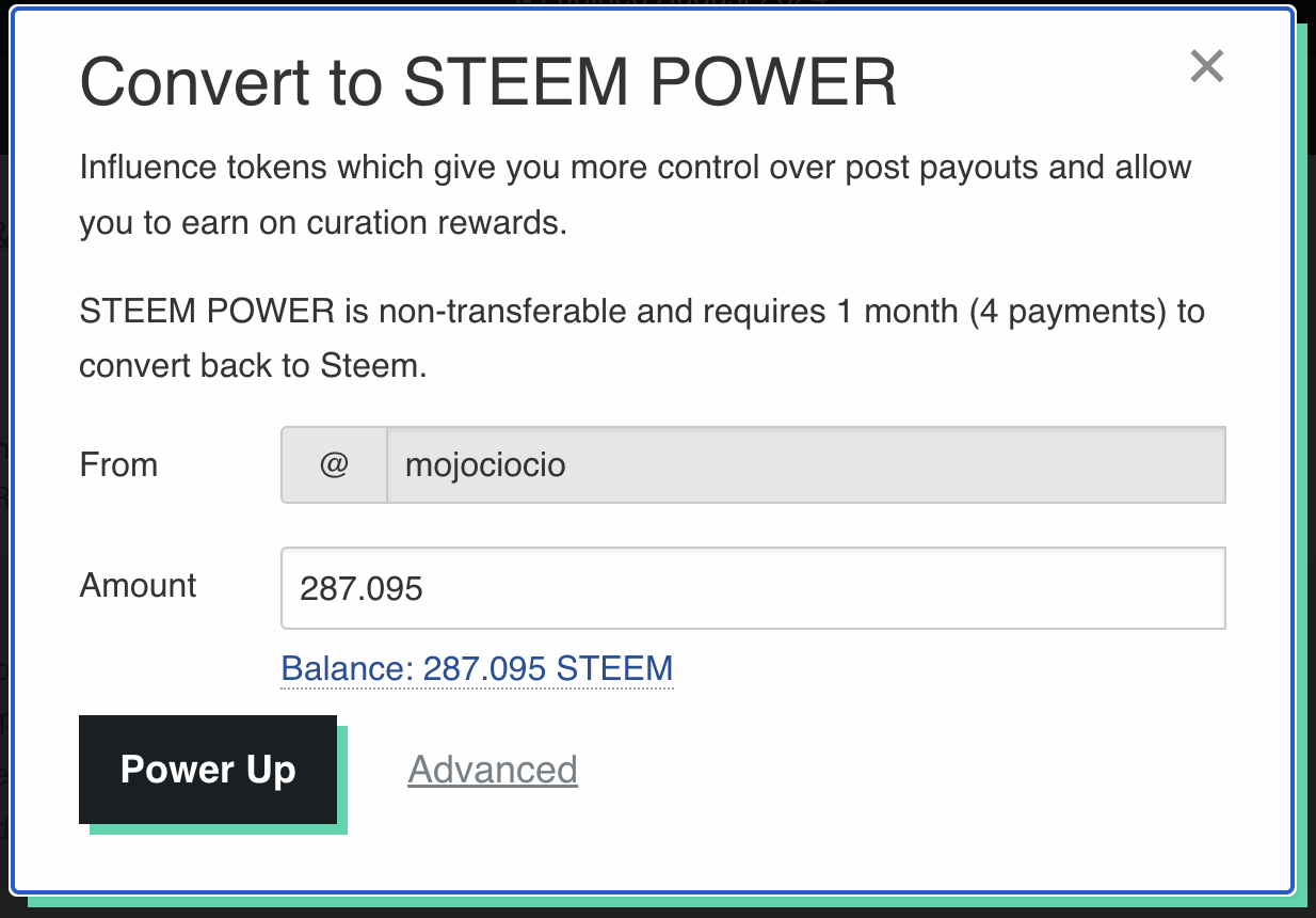 When choosing the Power Up option, a new window will pop up that will prompt the user to enter the amount he wants to use. In my case, I will power up my whole balance of liquid STEEM: