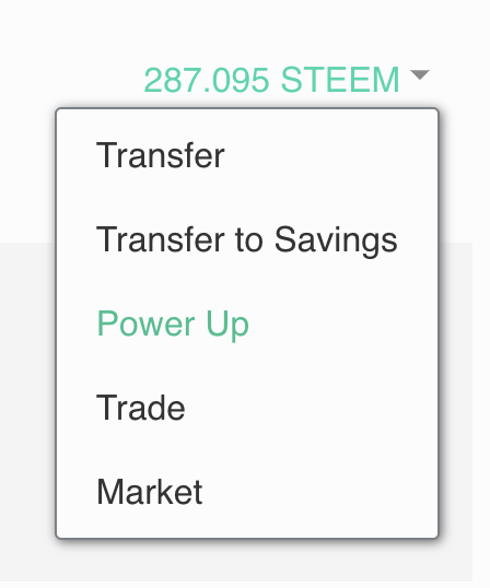 To start the Power Up process, we can click on the STEEM balance and a drop down menu will appear, like this and since we want do a power up we will click that button: