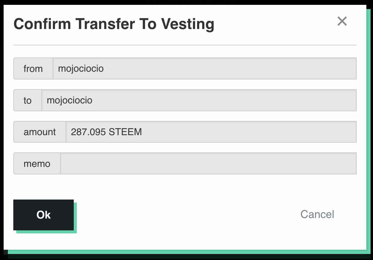 After clicking the Power Up button, a new window will appear for the user to confirm the transaction and add a memo if they want: