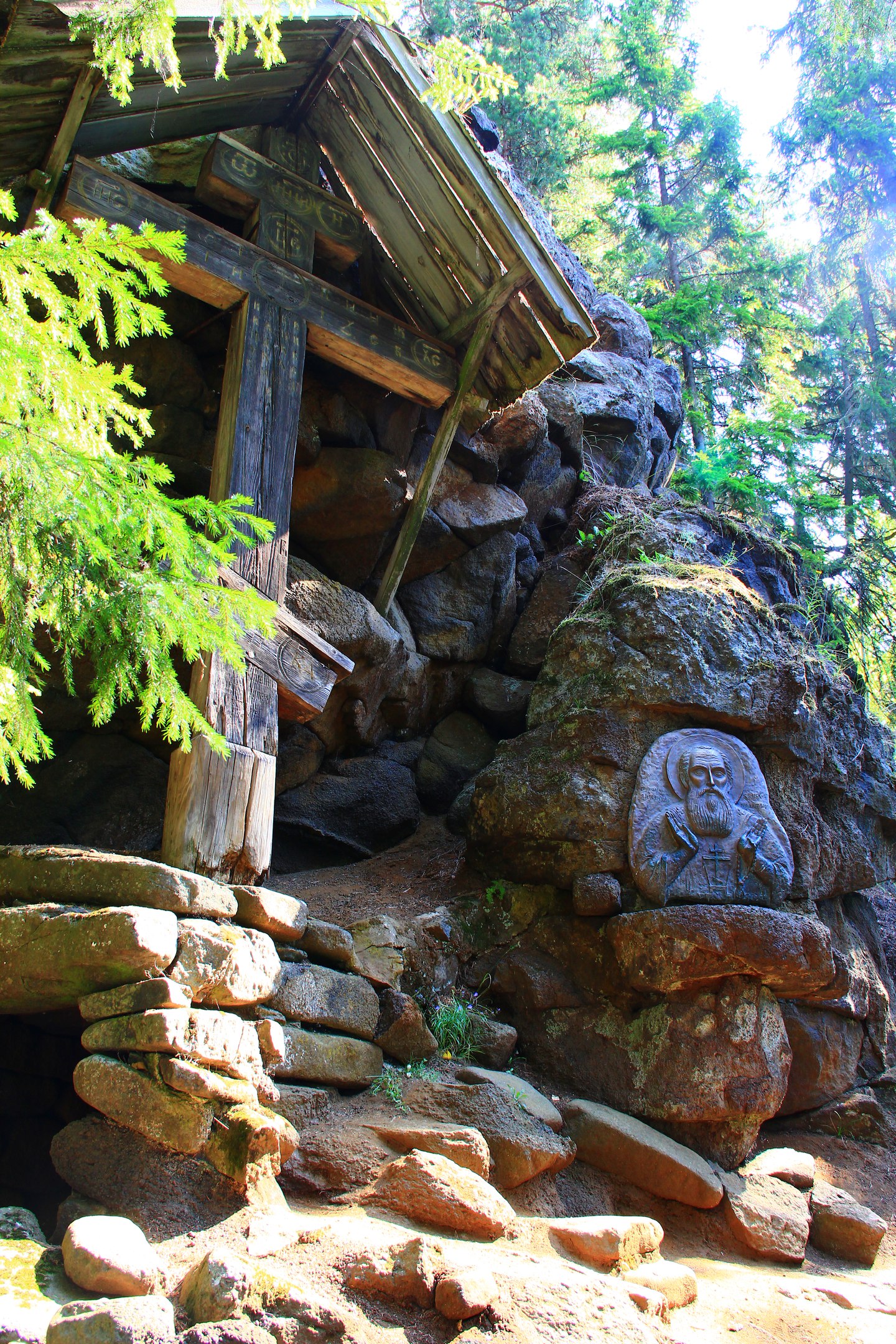 Another island Skete, this is the Skete of Alexander Svirsky. He is a great saint of the Russian Orthodox Church. This ascetic was rewarded during his lifetime with the visit of the Mother of God and the appearance of the Trinity. His monastic journey started on Valaam, he retired on this island and led an extremely ascetic life. He lived in this cave: