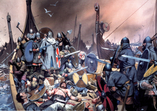 Scene from “king Olaf Tryggvason’s saga” by Angus McBride Climatic episode of the battle of Svolde(King Olaf left of the center)image courtesy of Armchairgeneral