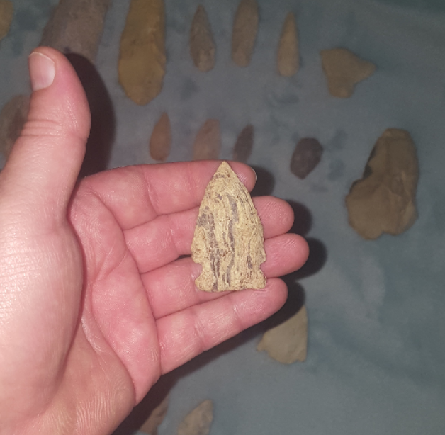 The point, my first discovery that was totally my own, was made of a banded rhyolite that looked almost like the bark off an oak tree. It was medium-sized for the points in our area, and had been weathered quite a bit. But the ears (the little points hanging down by the bottom) were intact, the point at the end was still attached, and there didn’t appear to be any breaks. Not only was this my first find, but it was an intact point at that! And it was at that moment that the little kid in my kicked into high gear and I started dancing around and screaming with joy.