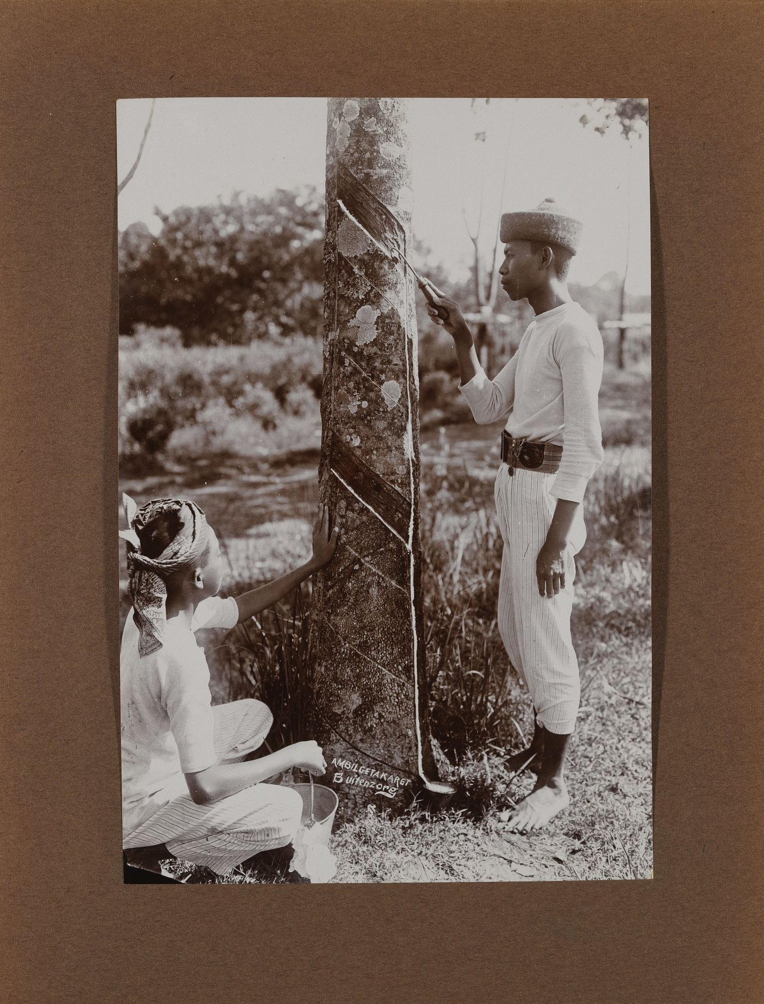 The photo above shows two workers tapping rubber latex in what is now the Bogor Botanical Gardens circa 1938. This photo was taken by Wijnand Elbert Kerkhoff and the archive is kept by the National Gallery of Australia.