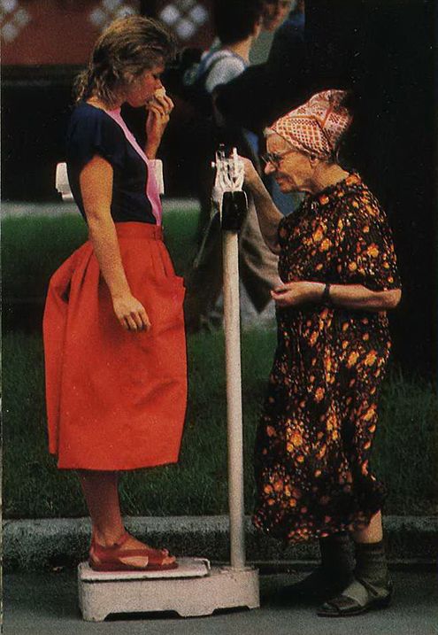 "Get in shape and lose weight!" - This call can be heard throughout the USSR. On the Kiev street the girl is weighed for two copecks.