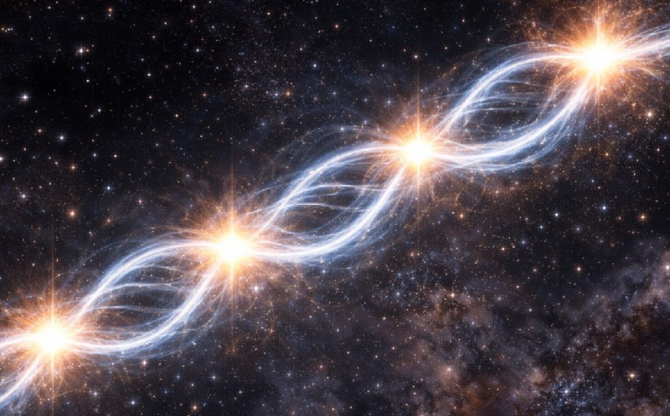 Electromagnetic forces (not gravity) do the heavy lifting in the cosmos. The most major form that takes is the Cosmic Birkeland Current, the most common form of which amounts to a pair of currents that cross each other like the double helix of a DNA/RNA strand. Those things are generally straight(ish) and the points where the two currents cross each other generate electromagnetic pinches (Z-Pinch points) that (unlike gravity which is many orders of magnitude weaker) DO in fact have the power to agglomerate the plasma of space into stars. A Birkeland current with stars in various stages of formation at those pinch points like that is called a Hirbig/Haro object or string: