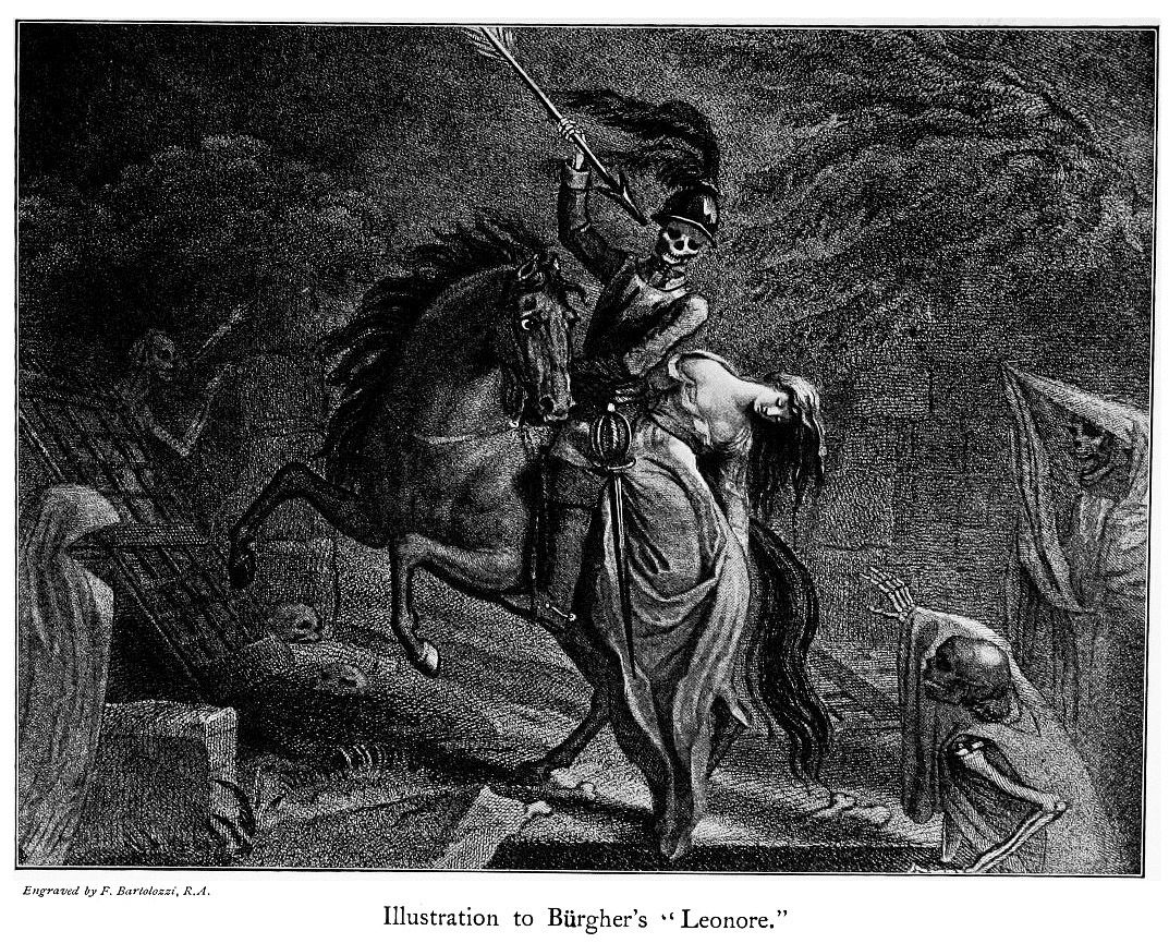 Gottfried August Bürger (1747-1794) made this story famous with his 1773 poem, ‘Lenore’. Within a decade after its publication, the German-language masterwork appeared in English translation, becoming an immediate sensation and apparently influencing Coleridge, Wordsworth, and other Romantic-Era British poets. Bürger’s publication was so influential that folklorists often refer to the tale simply as ‘The Lenore Legend’.