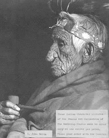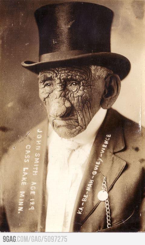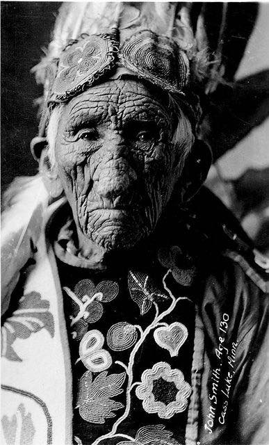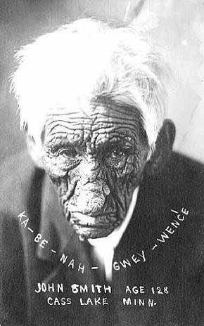 THE LEGENDS OF JOHN SMITH:- John Smith, age 128-129, ca. 1912. Ga-Be-Nah-Gewn-Wonce, also known as John Smith, was a Chippewa Indian reputed to be 137 years old at his death. He often recalled the days when he was a scout for the Chippewas in the wars with the Sioux. He remembered events of the war of 1812. One of his boasts was that he had never fought against the white man. He was alive in 3 different centuries.
