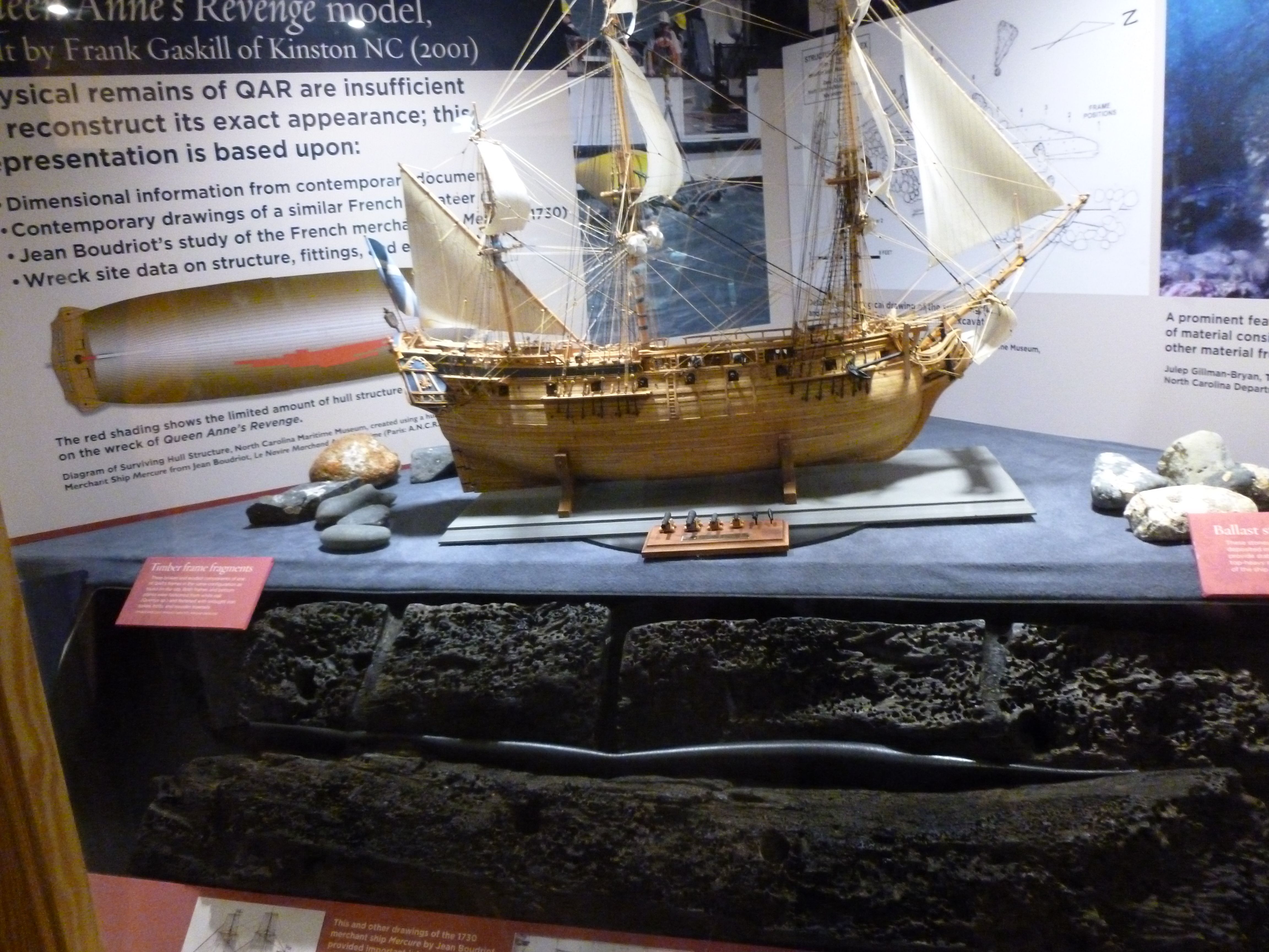 At the bottom is timber from the wreck that survived 350 years on the sea bottom. Also you can see ballast stones, a great model, and the area in red on the hull that was recovered.