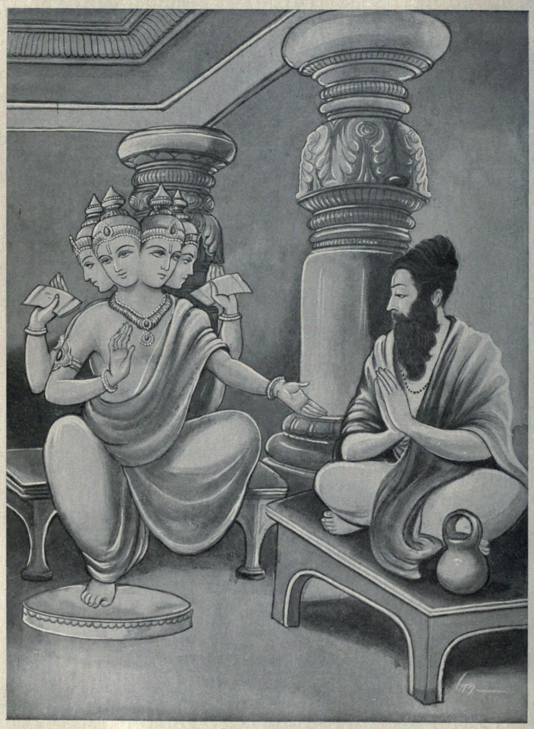 Sauti continued, "The sage Vyasa, through penance and meditation deeply analysed the eternal Vedas and composed this holy history. When the noble sage Vyasa had finished this great narrative work, he began to ponder how to teach it to his disciples and propagate it to the society at large. While he was thinking thus, Brahma, the world's preceptor, knowing sage Vyasa's anxiety came in person to the place where the latter was. Sage Vyasa was gratified by lord Brahma's presence. Sage Vyasa, surrounded by all the tribes of ascetics, approached lord Brahma with joined palms, he bowed reverentially and ordered a seat to be brought. After the lord was seated, sage Vyasa went around him once with devotion and stood near his seat. On being commanded by lord Brahma with affection, he sat down near the seat, smiling in joy."
