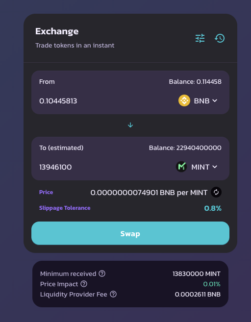 이제 드디어 민트 토큰을 구매할 차례입니다. 민트 토큰은 팬케익스왑이라는 탈중앙거래소에서 구매 가능합니다.