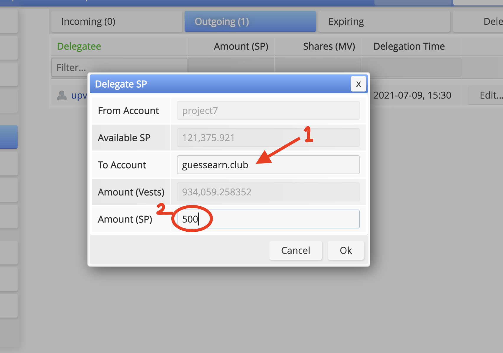 아래와 같은 팝업이 뜹니다. 거기서 To Account에는 guessearn.club를, Amount (SP)에는 500 을 입력하고 OK를 클릭하시면 다시 다른 창에서 스팀 키체인으로 할거냐 마스터키 입력할거냐 물어봅니다. 이 과정을 마무리 하고 한 5분정도 기다려 보면 본인 스팀 파워가 임대되어 있는걸 확인할 수 있습니다.