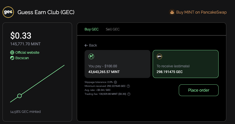 첫 거래일 경우 당신 지갑의 MINT 를 스마트컨트렉트가 사용할 수 있도록 허가해 달라~~ 하는 승인요청이 먼저 뜨는데요, 이걸 컨펌처리 하면 다시 아래 이미지와 같은 구매 패널이 뜹니다. 확인 후 다시 Place order 버튼을 누르고 지갑에서 승인처리 하면 드디어 GEC 토큰 구매가 완료됩니다!!