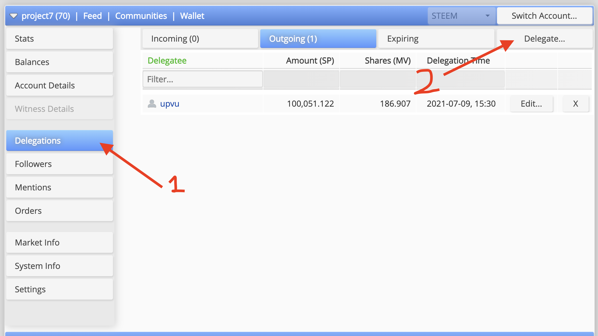 해당 페이지에서 Delegation 탭 > Delegate 버튼을 클릭하세요.