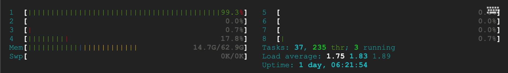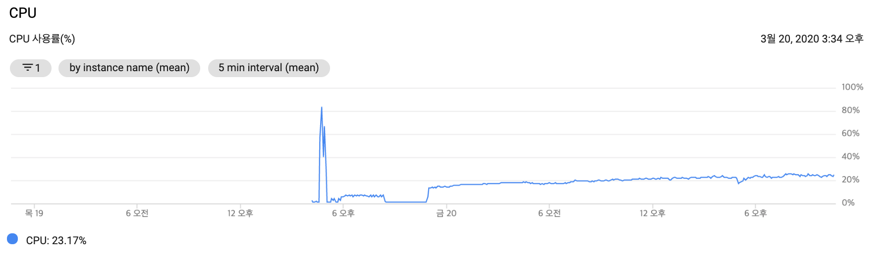 빌드시에만 거의 100%를 사용 하였고 이후에는 약 20~25% 수준을 유지하고 있습니다.
