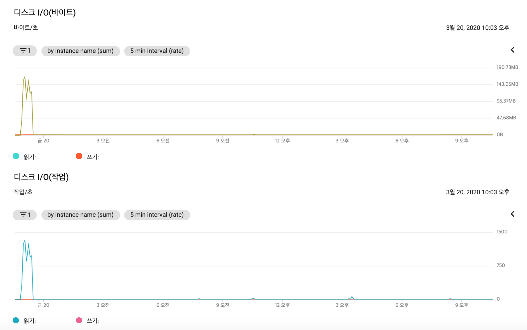 초기 build 시에만 디스크 I/O 가 높게 나타나고 현재 replay 중에는 낮게 표시되고 있습니다.