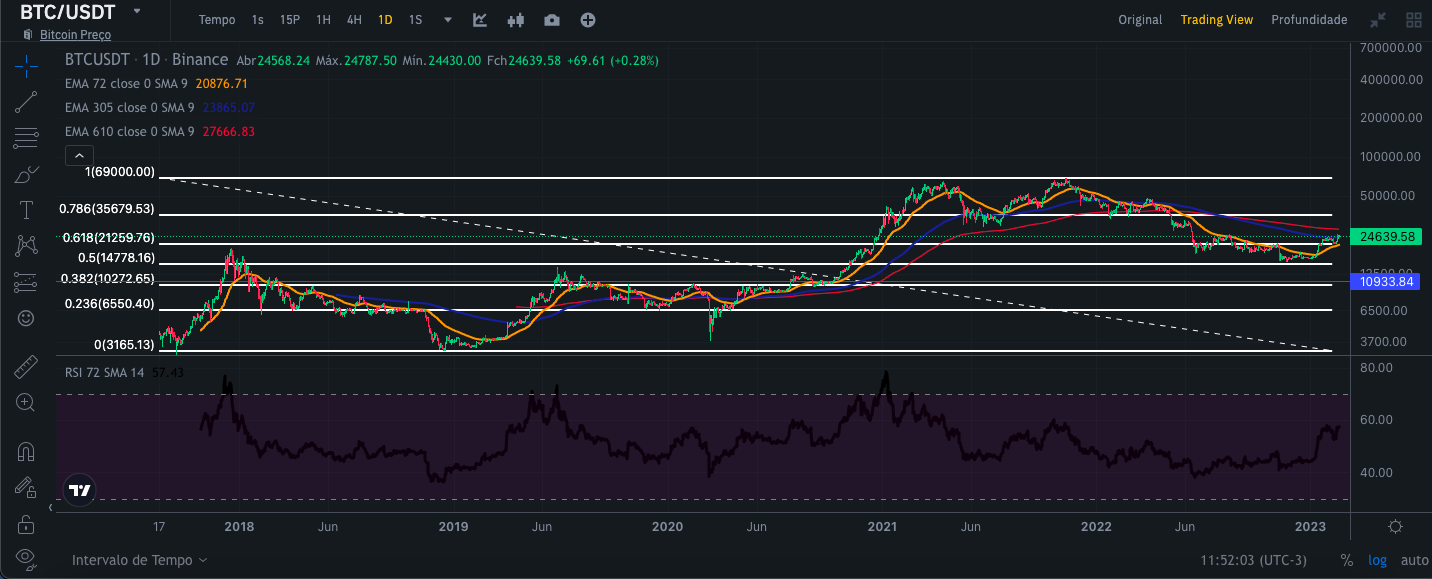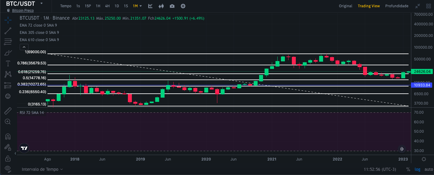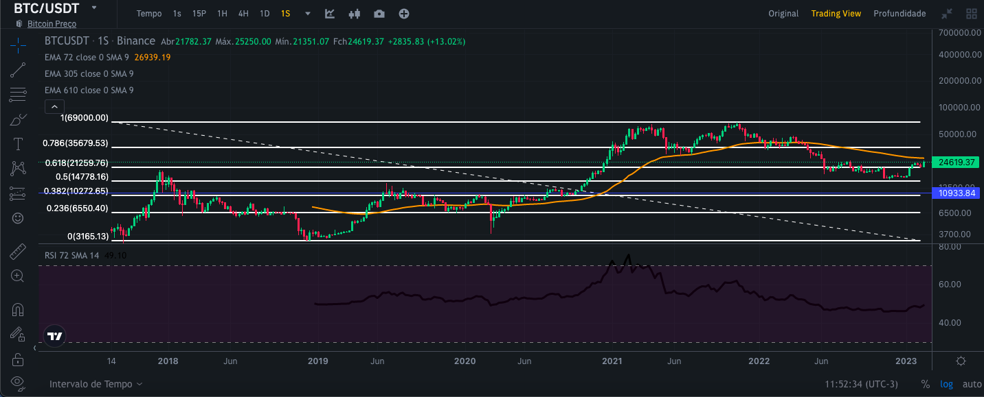 Para realizar essa análise, usei as visualizações do gráfico de velas da Binance por 1 dia, 1 semana e 1 mês, respectivamente, juntamente com as curvas médias exponenciais de 72,305 e 610 dias, canal de tendência de preços. e RSI desde 09/11/2017. Dessa forma, tenho um escopo mais amplo para poder fazer uma análise mais segura com uma série histórica maior. Vale lembrar que essa análise visa a médio e longo prazo.