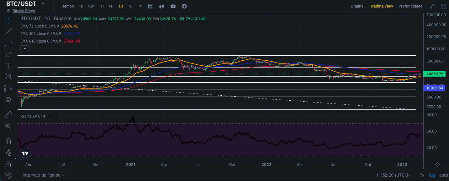To perform this analysis, I used Binance's candlestick chart views for 1 day, 1 week and 1 month respectively, along with the exponential average curves of 72,305 and 610 days, price trend channel. and RSI since 11/09/2017. So I have a broader scope to be able to do a safer analysis with a larger historical series. Remember that this analysis aims at the medium and long term.