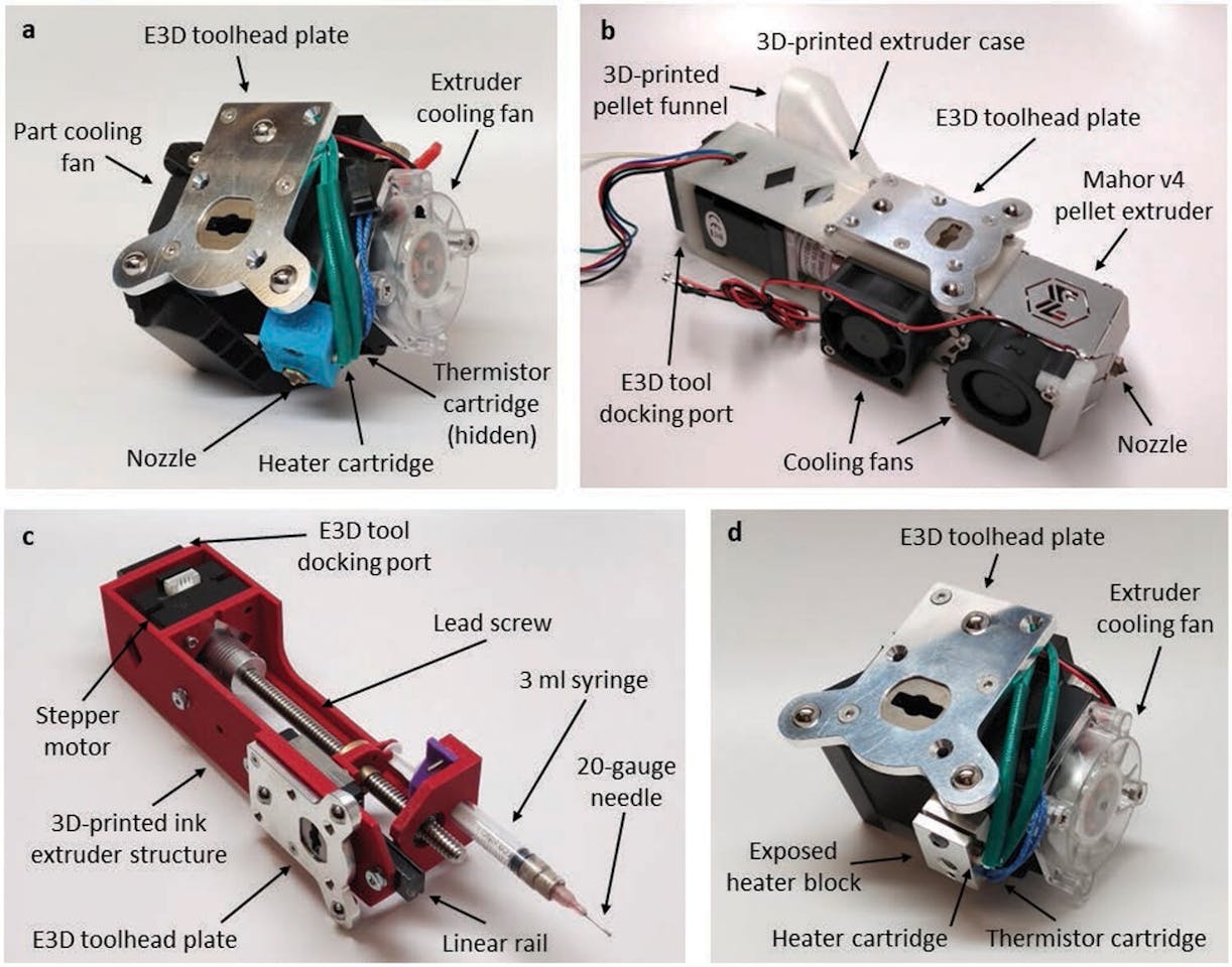 Para conseguirlo, los investigadores modificaron una impresora 3D comercial, equipándola con un sistema de cambio automático de herramientas que incluye varios tipos de extrusores. Un extrusor de tinta conductora (por ejemplo plata) para crear los circuitos y bobinas. Un extrusor de gránulos de compuestos magnéticos para fabricar el núcleo magnético y los imanes permanentes. Finalmente un extrusor de filamentos de polímeros rígidos y flexibles, para construir la estructura, el aislamiento y componentes móviles como resortes.