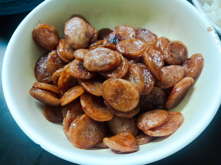 - กุนเชียงทอด (ฮีโร่กู้ภัยสายหวาน): และเมื่อความเผ็ดมันพุ่งปรี๊ด เราก็ต้องมีพระเอกมาช่วยดับไฟ! กุนเชียงทอดจานนี้แม้จะเป็นเมนูเร่งด่วน แต่ทอดมาได้เพอร์เฟกต์ระดับโลกครับ! ขอบเกรียมกรอบนิดๆ สีแดงอมน้ำตาลสวยงาม พอกัดเข้าไปปุ๊บ ความหวานมันฉ่ำๆ ก็แตกซ่านในปาก! มันคือความขัดแย้งที่ลงตัวสุดๆ เอาความหวานนัวของกุนเชียง ไปเบรกความเกรี้ยวกราดของผัดหน่อไม้ดอง... บอกเลยว่า ตักผัดหน่อไม้คำ กัดกุนเชียงคำ เคี้ยวสลับกันไปมา ฟินจนลืมดูนาฬิกาเข้างานเลยครับ!