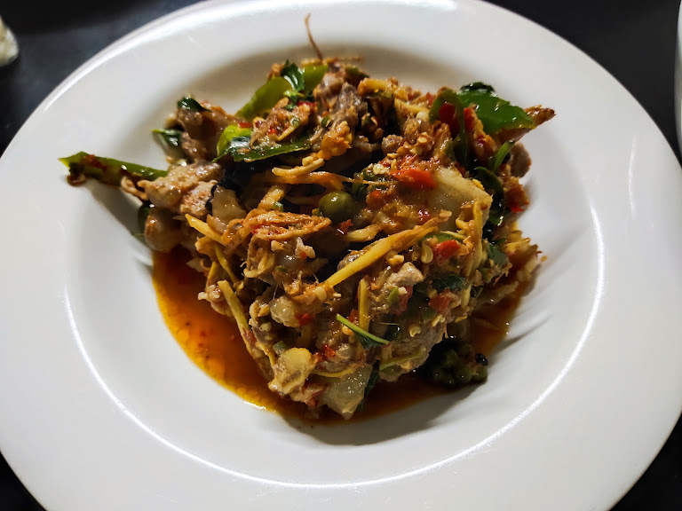 - Stir-Fried Spicy Catfish (Phad Phed Pla Duk): This isn’t just a dish; it’s an explosion! Imagine crispy-yet-tender catfish chunks tossed in a fiery red curry paste. The aroma of wild ginger (Krachai) and fresh peppercorns hits you before the first bite. It’s crunchy, herbal, and packs a punch that’ll have you reaching for more rice immediately!