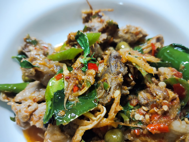 - ผัดเผ็ดปลาดุกทอดกรอบ: จานนี้คือที่สุดของความเร้าใจ! ปลาดุกหั่นชิ้นทอดจนกรอบนอกนุ่มใน คลุกเคล้ากับพริกแกงเผ็ดจัดจ้าน เพิ่มความหอมระเบิดระเบ้อด้วยกระชายซอยและพริกไทยอ่อน เคี้ยวไปแต่ละคำบอกเลยว่า "สะดุ้ง" ถึงใจ ข้าวสวยร้อนๆ ต้องเข้าแล้วครับงานนี้!