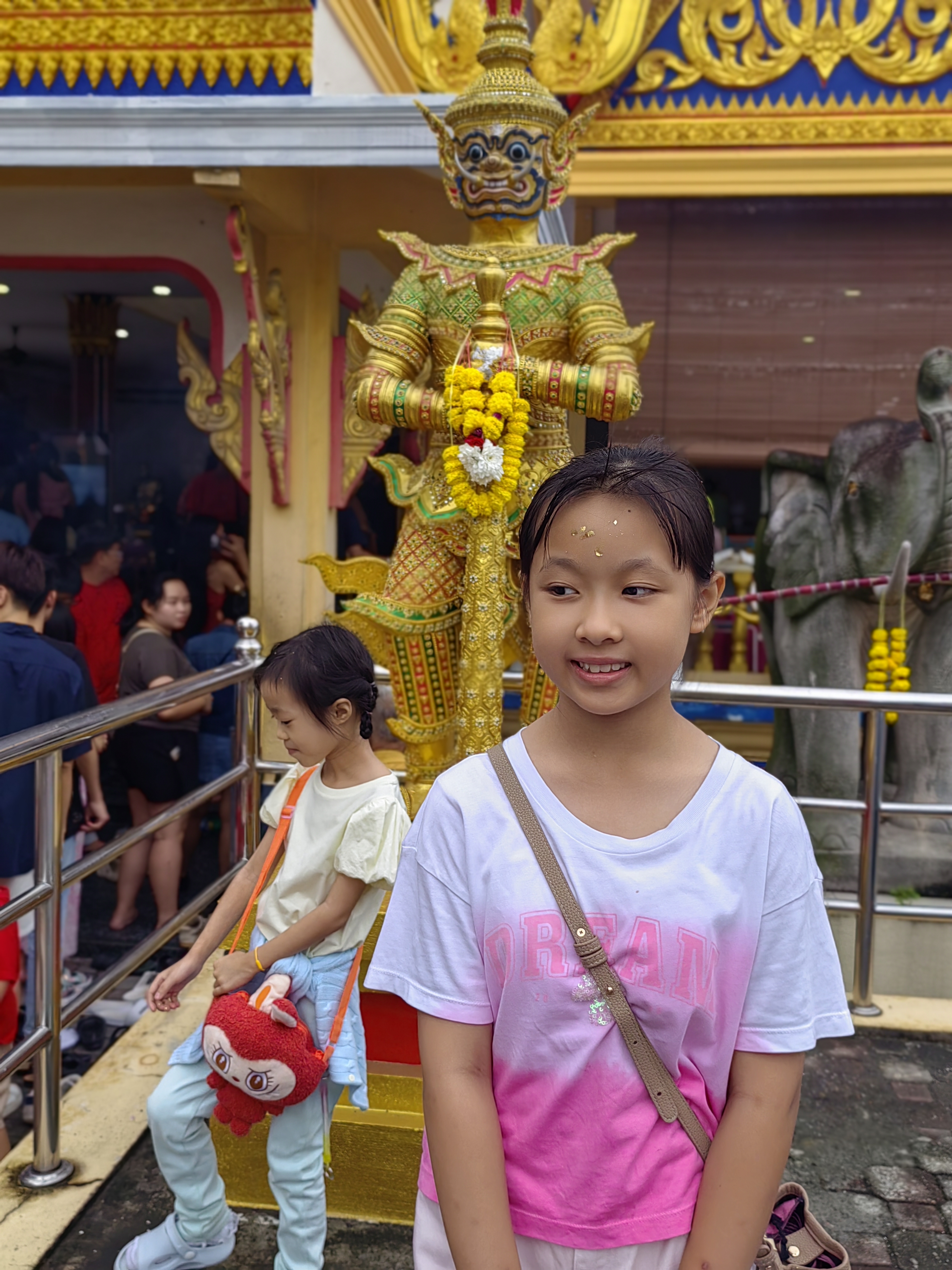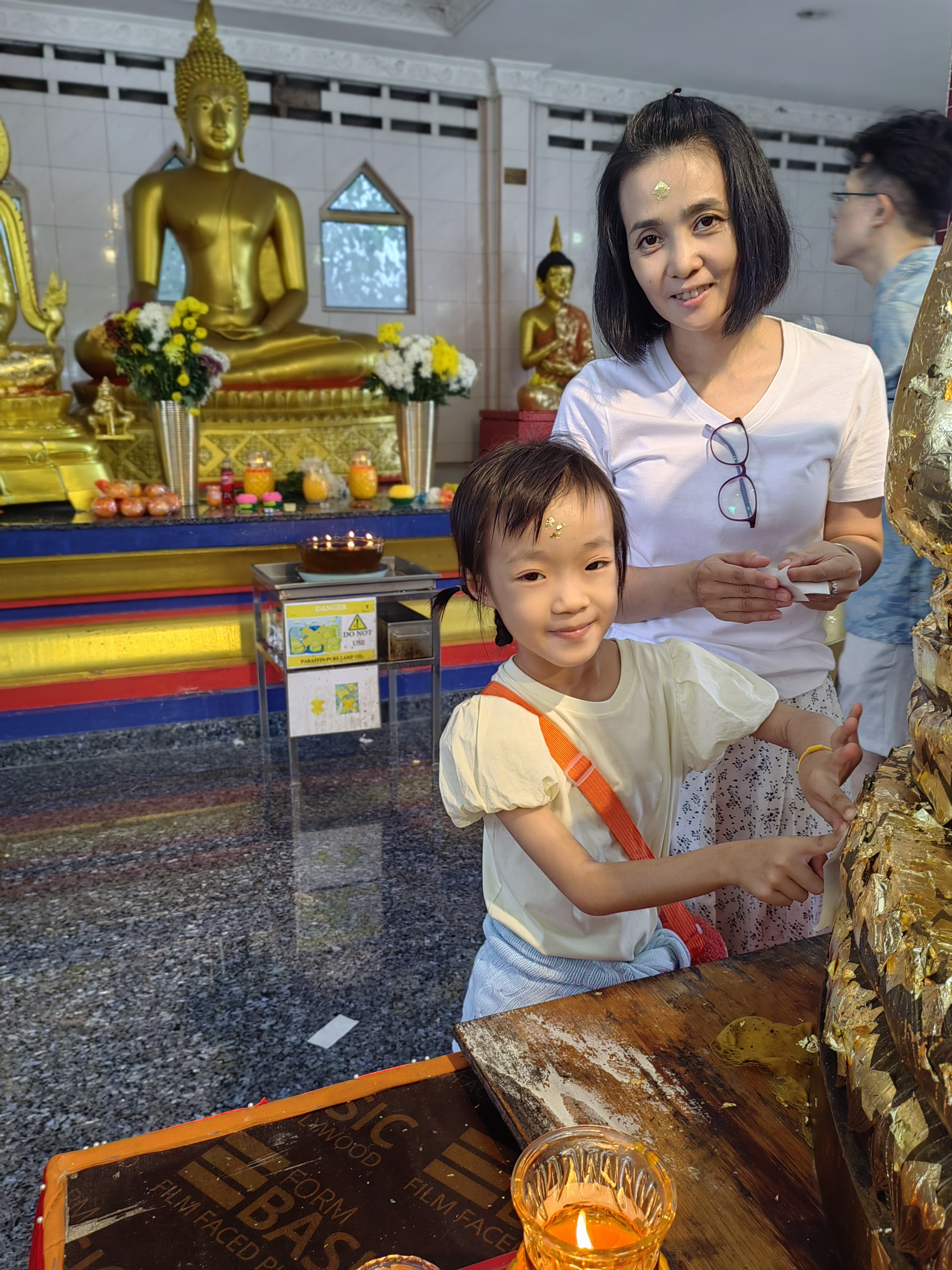 Hello everyone! During the recent holiday, I had planned to take my children to a temple, our usual one, to make merit. This temple has a very long history; King Rama IX once presided over an opening ceremony here, and I learned that he donated money to build the first Thai temple in Malaysia, which has a very long history. My children are of Thai-Chinese descent, and there are some cultural and religious differences between Thai and Chinese people. Therefore, I try to teach my children about Thai culture, even though we live in Malaysia and our family is 100% Chinese. My youngest daughter is quite curious about the culture... so it's easy to teach her. My eldest daughter is more indifferent, but she can still participate and learn, even though she sometimes seems tired of my attempts to teach her. Today was a very special occasion because a Buddhist monk was performing a forehead blessing ceremony for the Buddhist devotees who came to make merit. There were so many people today, and even though it was raining lightly, it didn't hinder the faith of the Thai and Chinese Buddhists with Thai families in making merit.