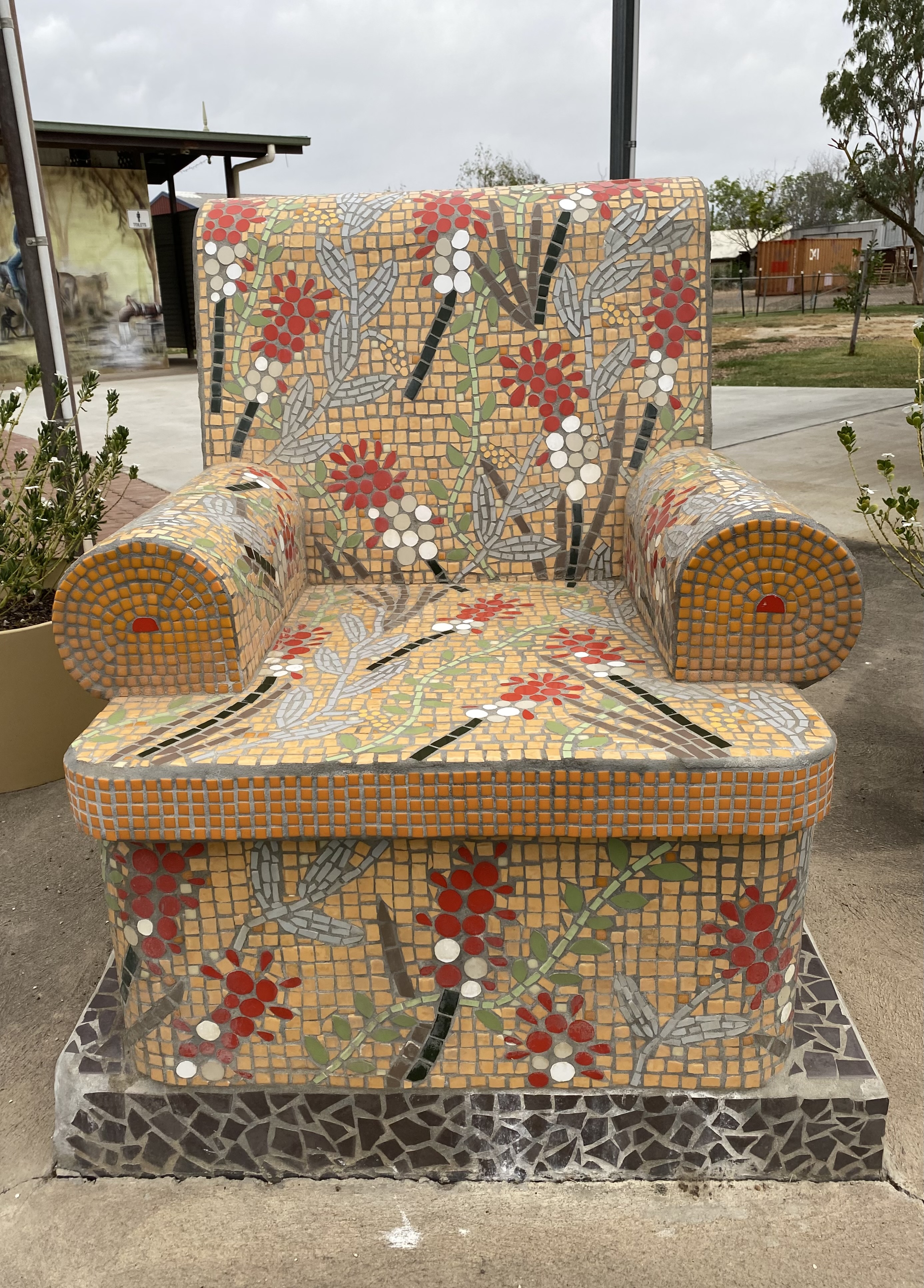 A mosaic tiled chair takes up a prominent position in a park along the main street of Julia Creek Queensland.