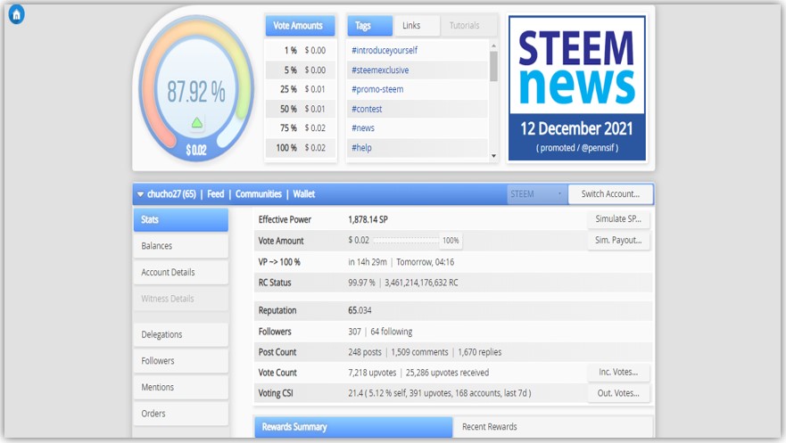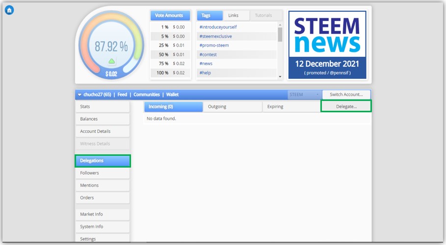 Es la cuarta vez que actualizo mi delegación a la comunidad, para iniciar con la delegación de SteemPower, debes utilizar la herramienta de SteemWorld, la cual nos permite obtener mucha información referente a nuestras cuentas ¿Cuál es la dirección de la página? Es muy fácil aquí se las dejo: https://steemworld.org/@chucho27 sólo cambias el nombre del usuario y listo, puede ver tu información, o la de la persona que desees.