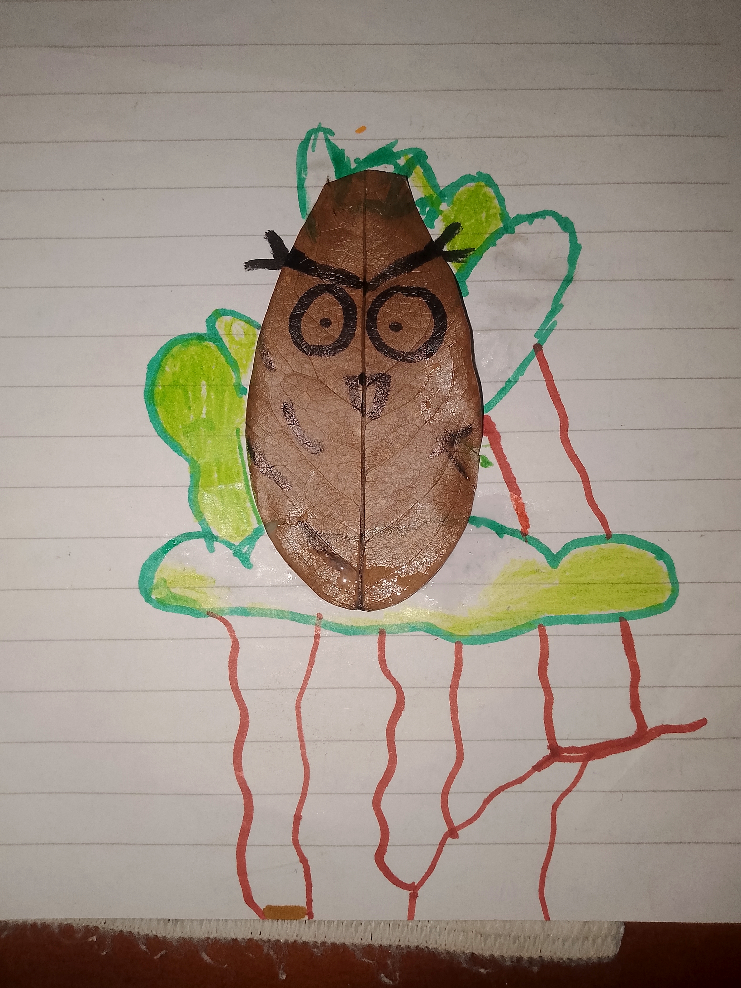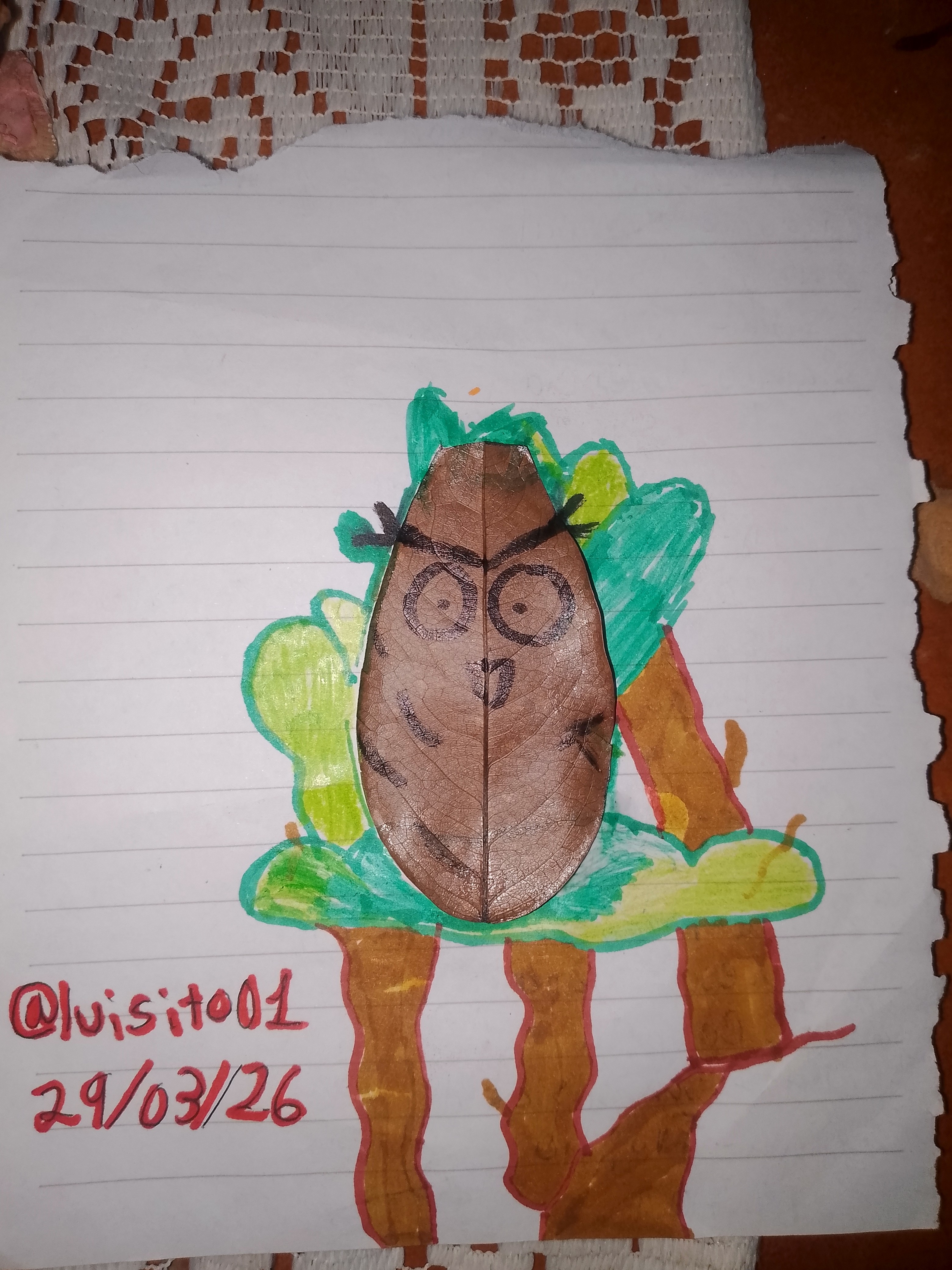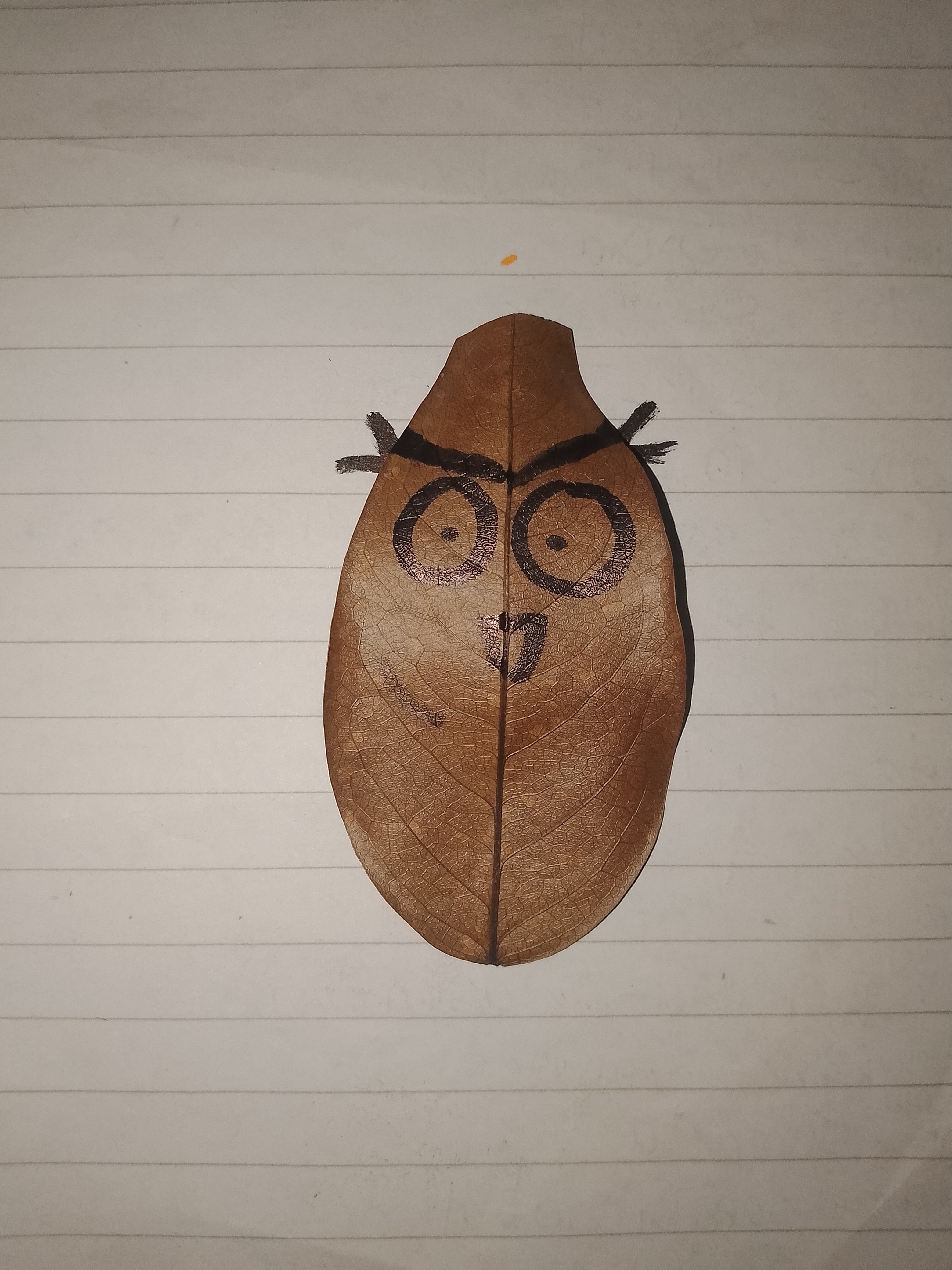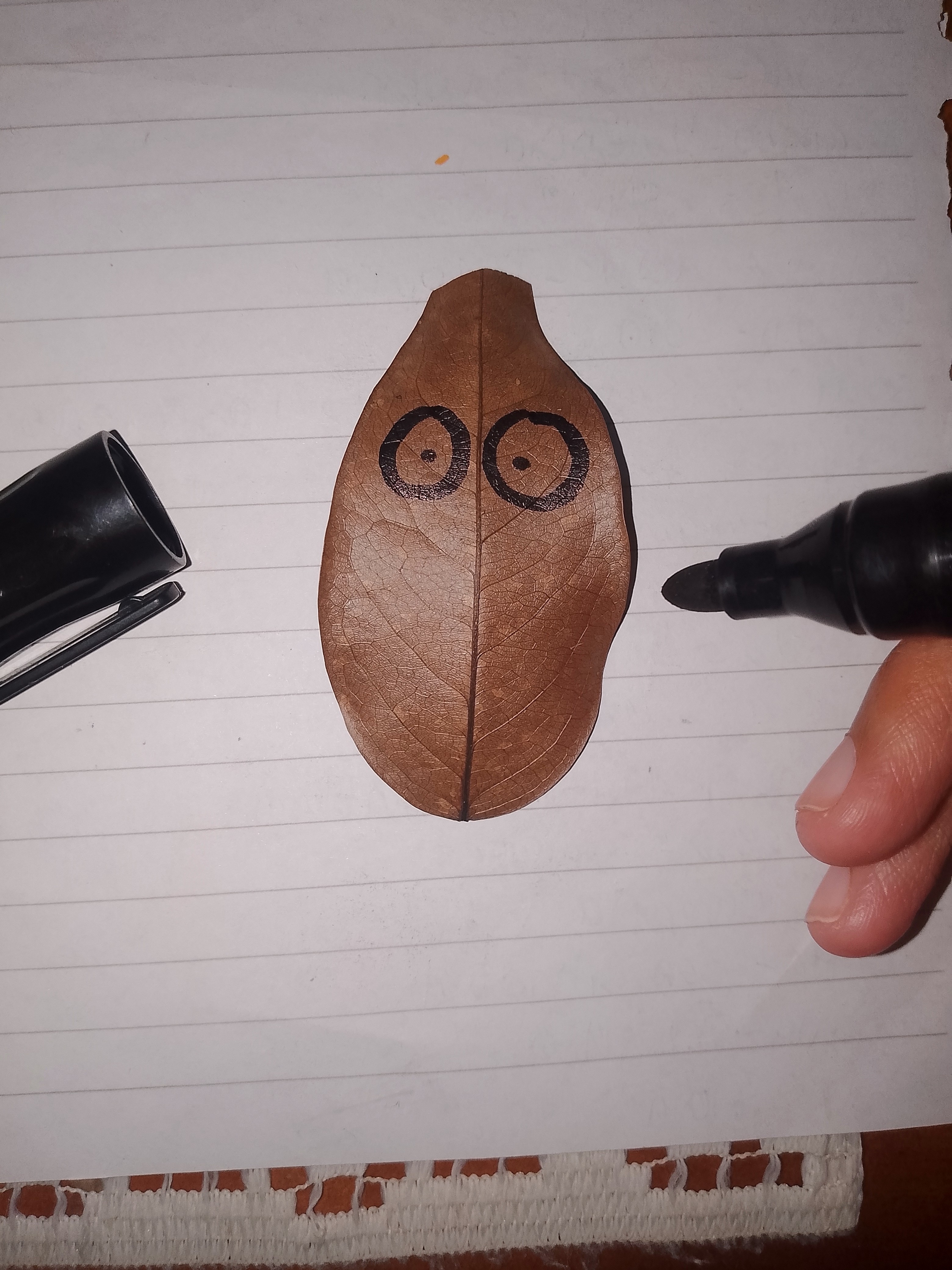- Agarré una hoja seca que ya estaba tirada; de hecho, había bastantes hojas, pero vi una y me dio una idea muy grande; era una hoja de forma algo particular, como la de un búho, así que no lo dudé y la agarré para luego dibujarle unos grandes ojos con marcador negro.