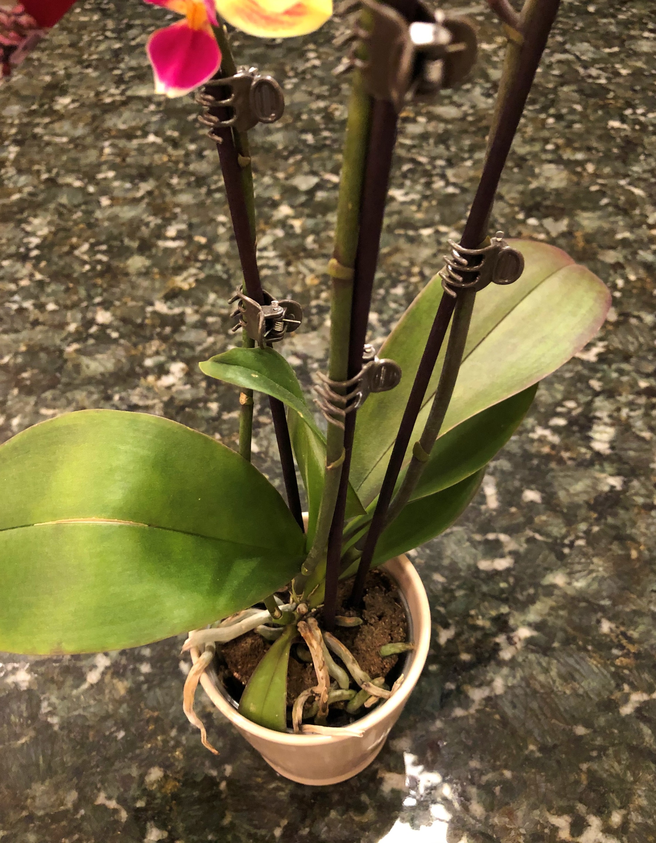 The stems are nicely staked and held into place with those tiny hair clips. I am sure they are made for the purpose of holding plant stems, but they look like hair clips to me. There are three stakes inserted into the pot to hold up the three bloom stems. I was also very thrilled that the plant had so many stems blooming. It must be a very happy Orchid.
