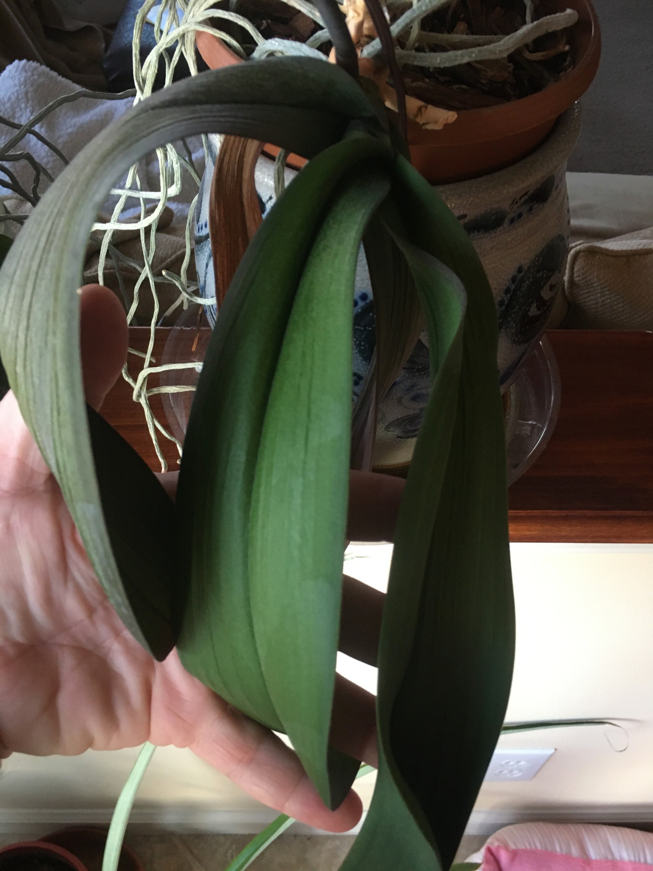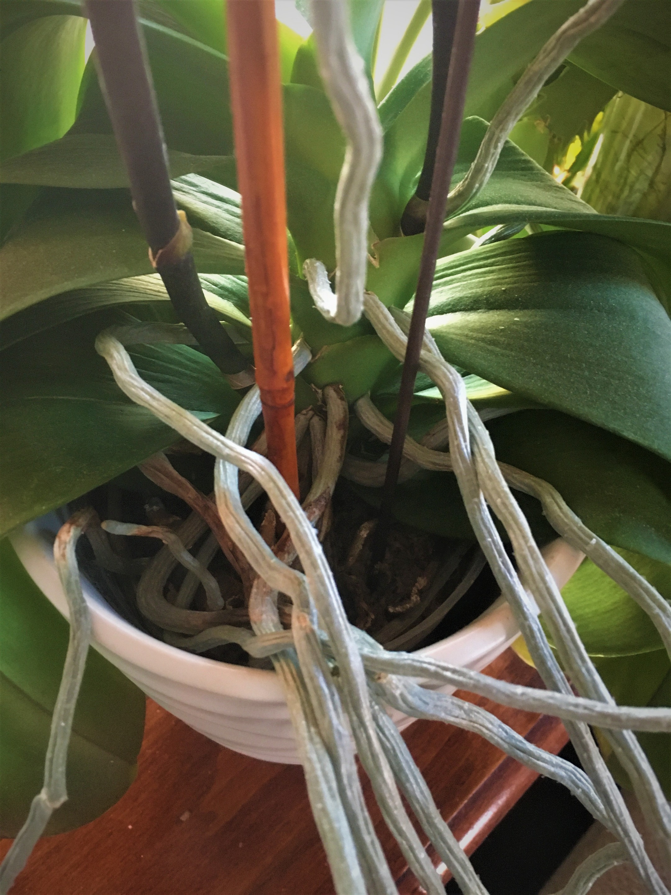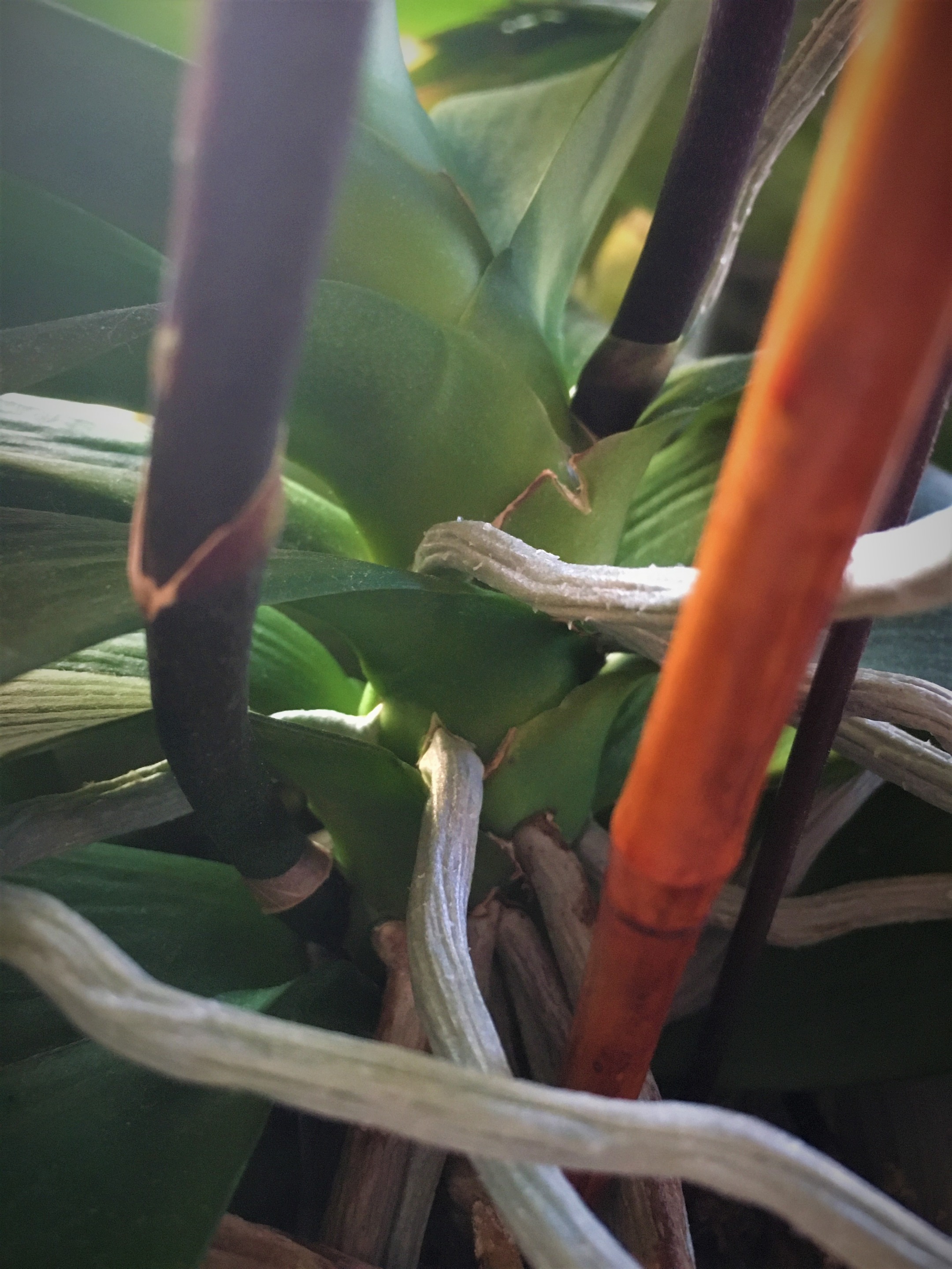 At the healthier of the two plants. Here is a good photo depicting the air roots and the stems of the blooms. Both protrude out of the foliage. They begin as a little nub that breaks through the leaves and continues to grow. They grow in opposite directions.. roots away from the light and bloom stems toward the light. Call me weird, but I find it exciting to keep checking or looking at the bases of the leaves for new shoots. Sort of like waiting for eggs in a nest to hatch.. sort of.