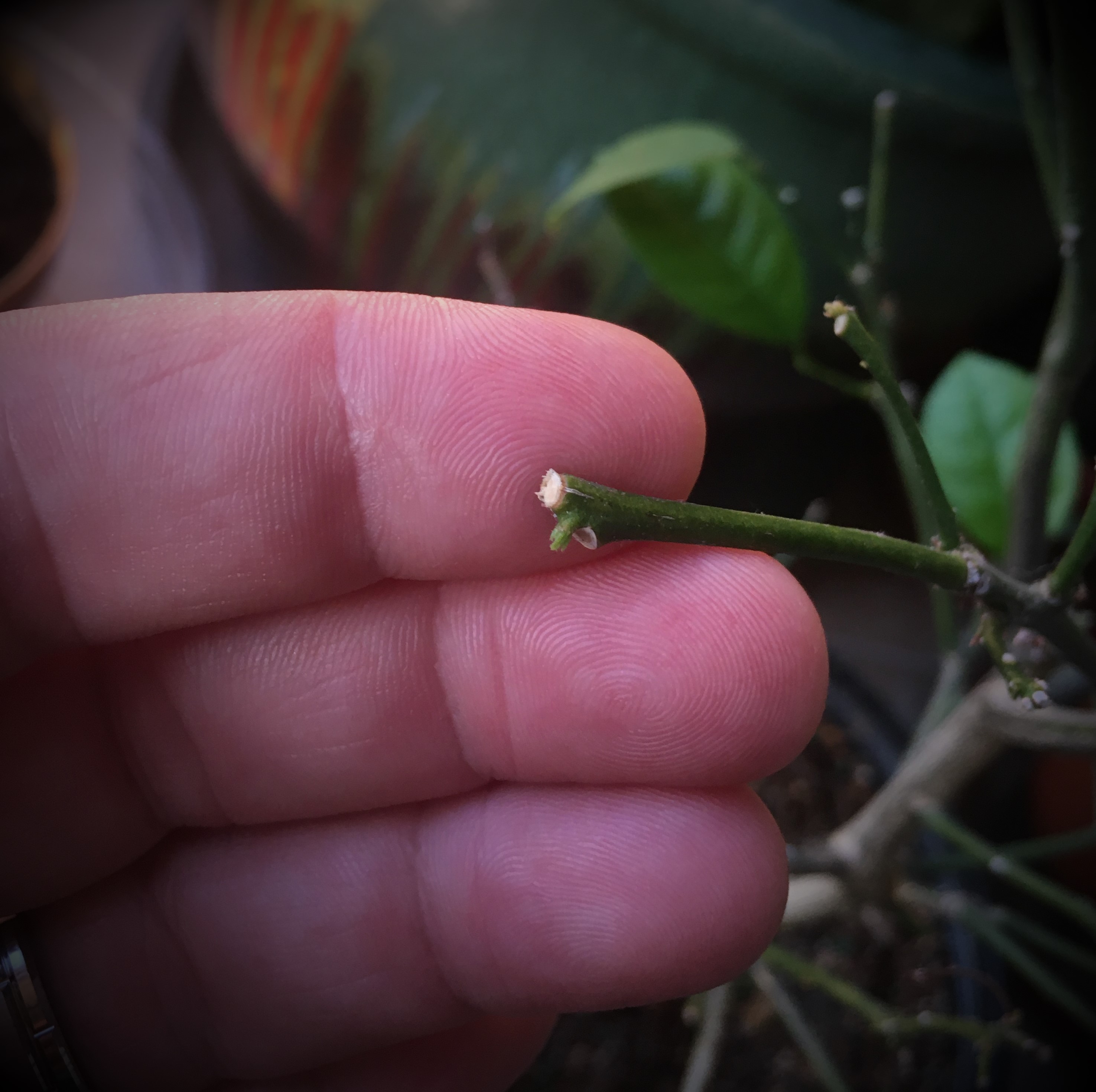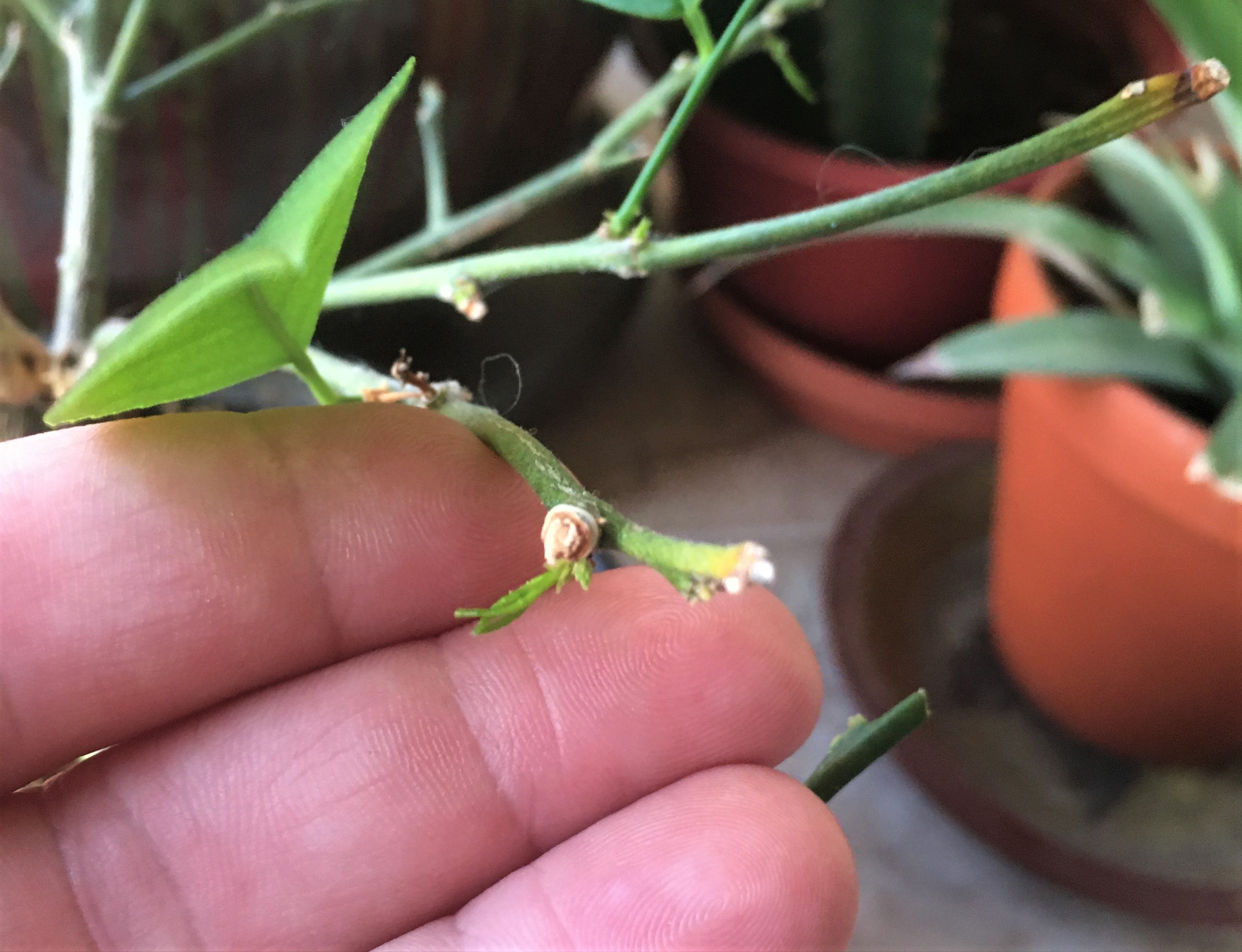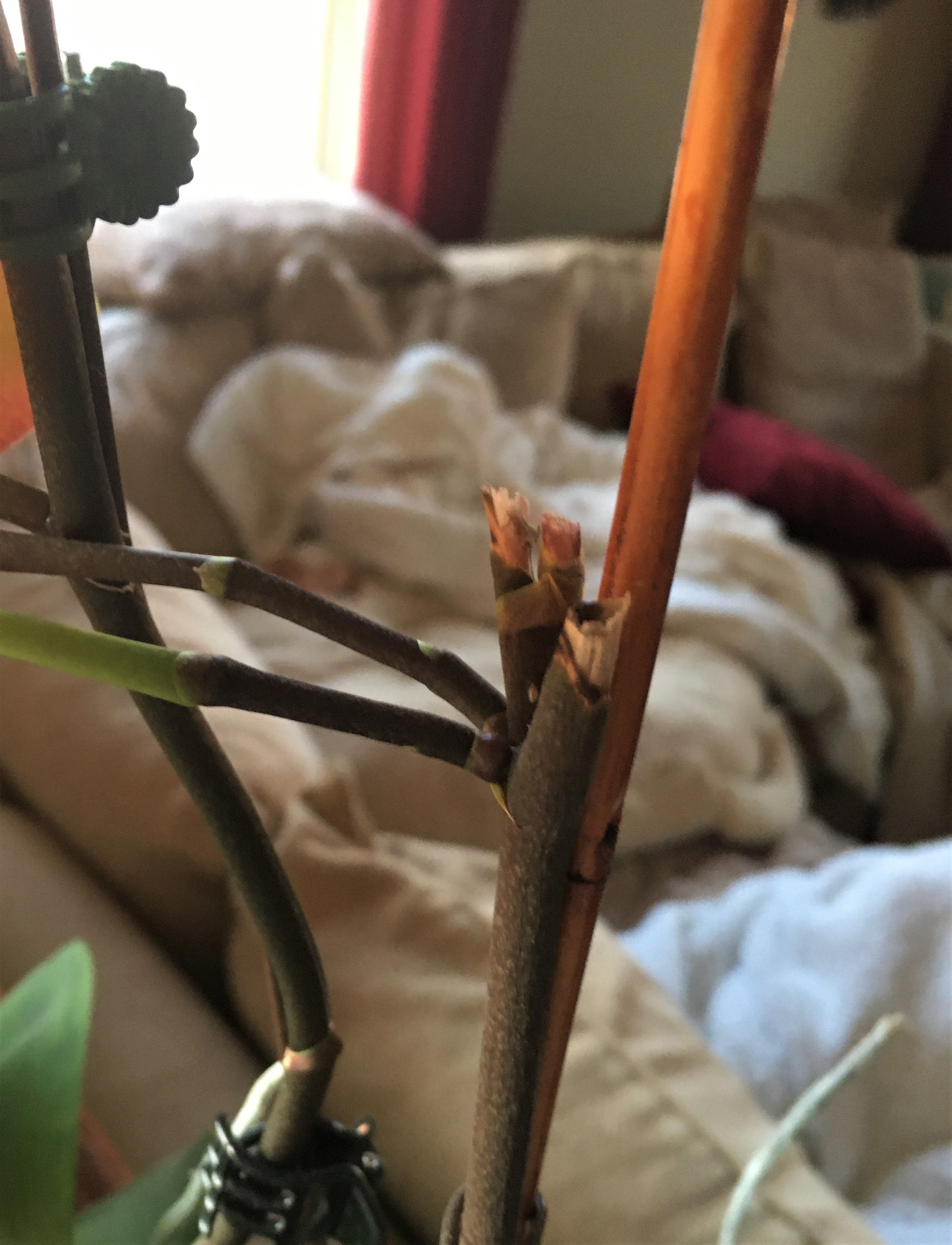 Here in this next photo, you can see where I cut the old bloom stems back just above another node. Not always, but occasionally the stem will push another bloom out from this point. It takes a while, up to 3 months or so, but its really cool when they do. I got lucky this round because all of my cuts produced a new bloom stem!!