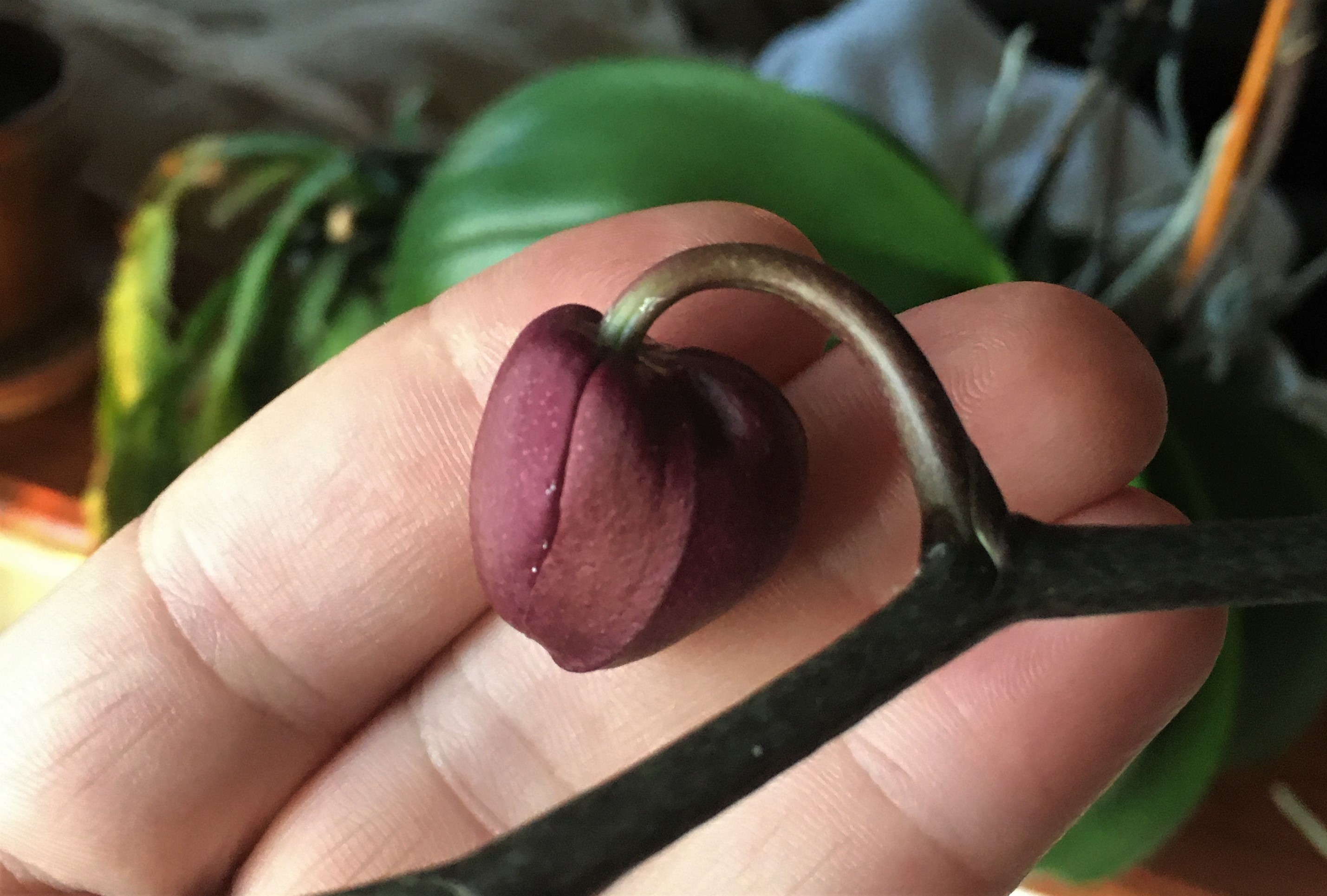 The flower buds on my 'Stressed Orchid' are growing in size, but have not started to bloom open yet. They look a little wilted as well, but healthier than the plant it's self.