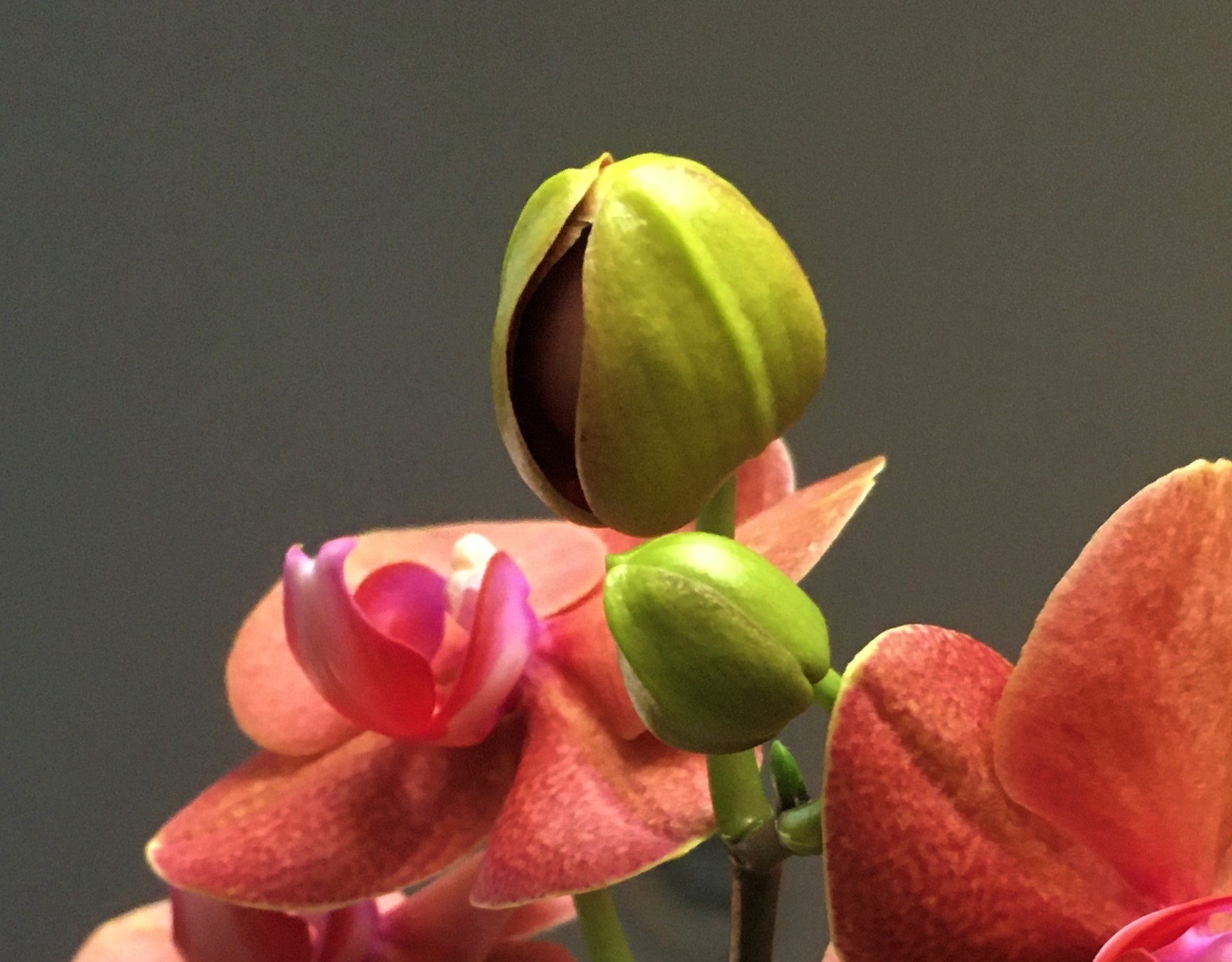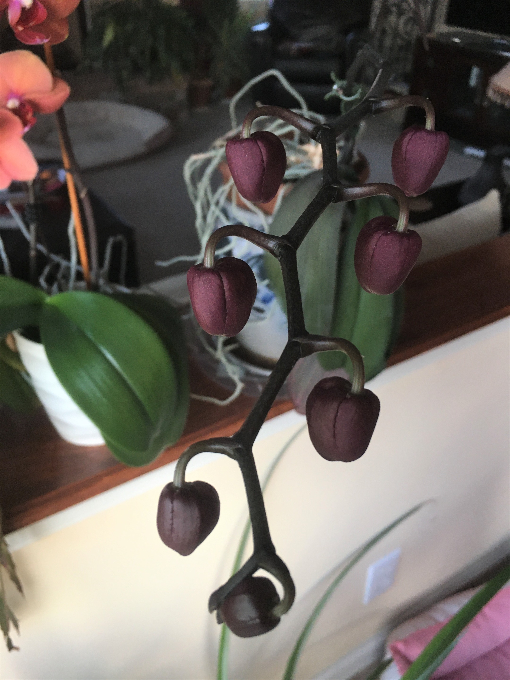 This is a close-up of the tip of the bloom stem. There are about two or three very tiny buds at the end. Sometimes they open after the other buds bloom and sometimes they don't and just dry up. You can barely make them out .. they are hiding there at the very end right next to that last large unopened bloom.