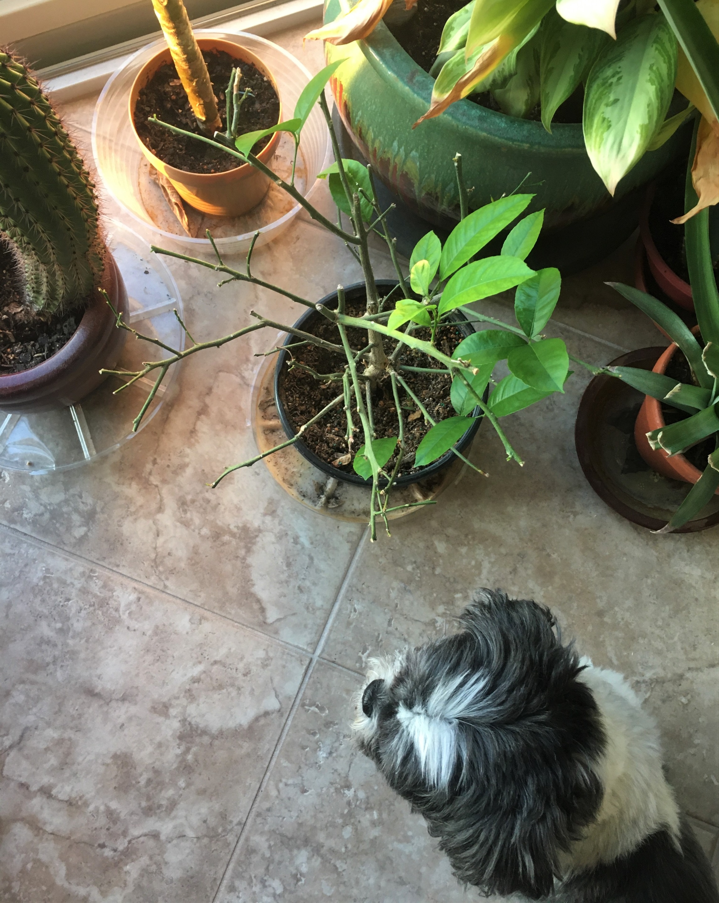 Our tiny little tree, although at first glance looks half dead, has been recently pruned. I pulled three nice lemons from her branches and since then it is starting to push out new foliage.