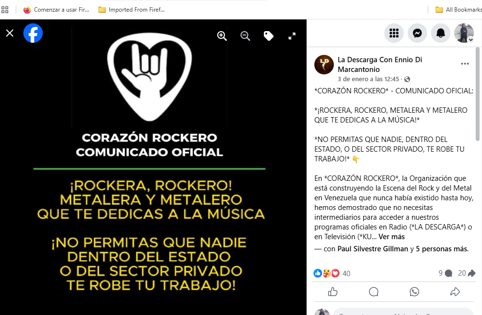 Beginning the year 2025, to be more precise, the Corazón Rockero Foundation, who have been doing their relevant work to reinvigorate the work of National Rock Made in Venezuela (concerts that start at the appointed time, payment to bands, presenters, technical staff, etc), issued a statement on serious allegations perpetrated both in the private sector (scams) and public (sector) corruption at the end of the year 2024.