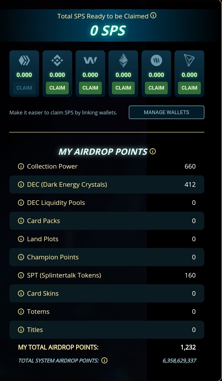 Es gibt 365 Tage lang - also bis zum 27.7.2022 wenn ich richtig gerechnet habe - täglich Airdrops an SPS an alle User, die SPT , Karten, DEC .... besitzen (siehe Bild oben). Je nachdem was man hat und wie viel davon, erhält man Airdrop Points. Je mehr Airdrop Points man hat, natürlich im Verhältnis zu allen anderen Usern, desto mehr SPS erhält man.