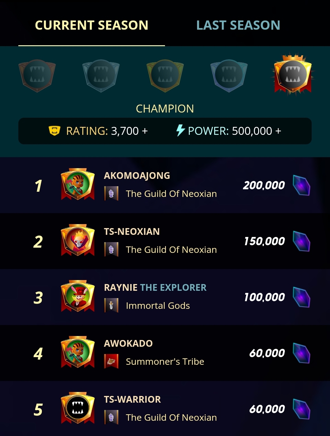 Ca. 2 Wochen geht eine Seasons bei der du dich unter Beweis stellen kannst. Je nachdem welchen Rang du erreichst, erhällst du eine bestimmte anzahl an Truhen am Ende der Saeson. Dabei zählt der höchste Rang den du erreicht hast, fällst du wieder runter wird der höhere Rang berücksichtigt.