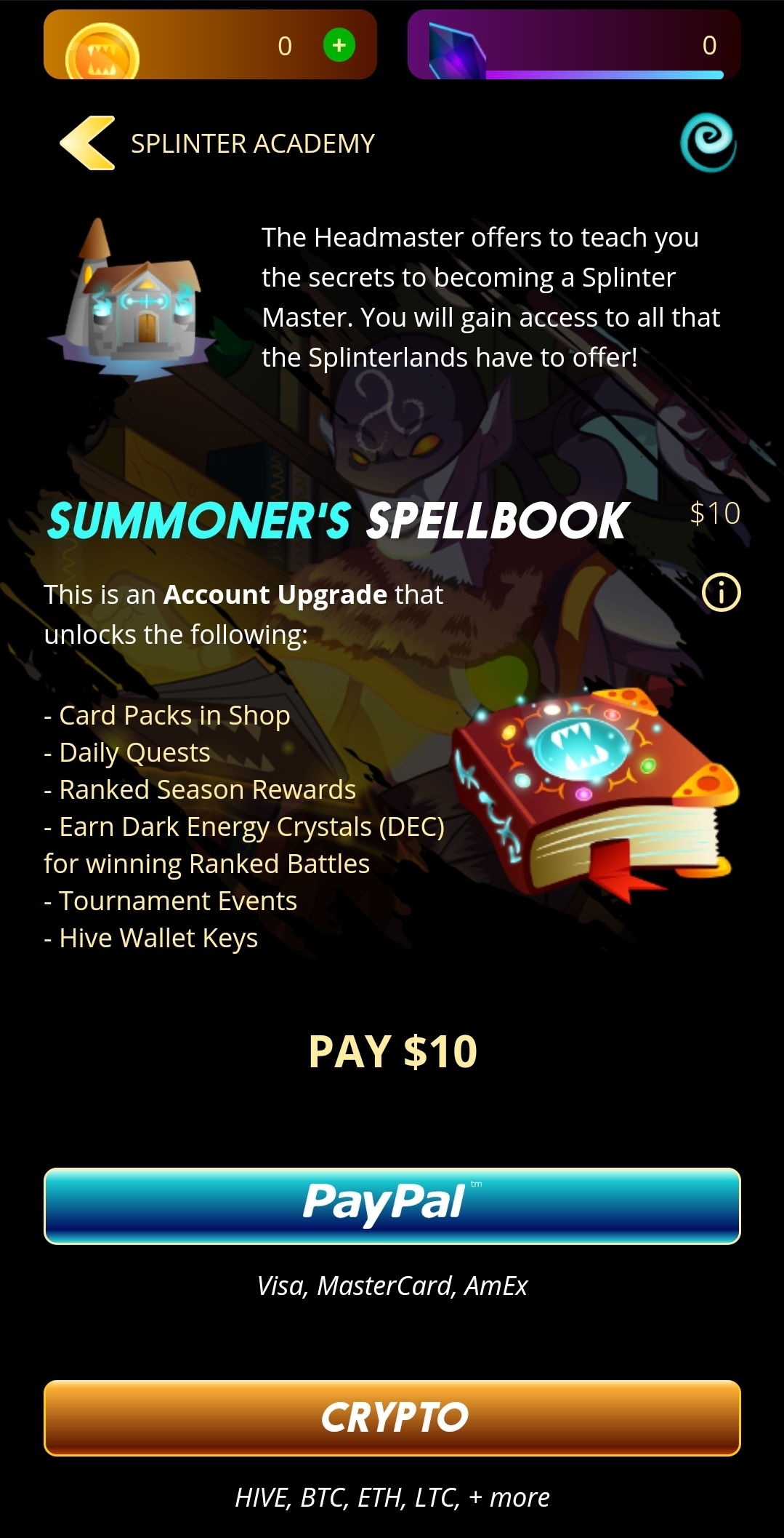 Damit all das freigeschaltet wird benötigt man "Summoner's Spellbook". Dieses kostet 10$ und kann per Paypal oder auch mit div. Kryptos bezahlt werden.