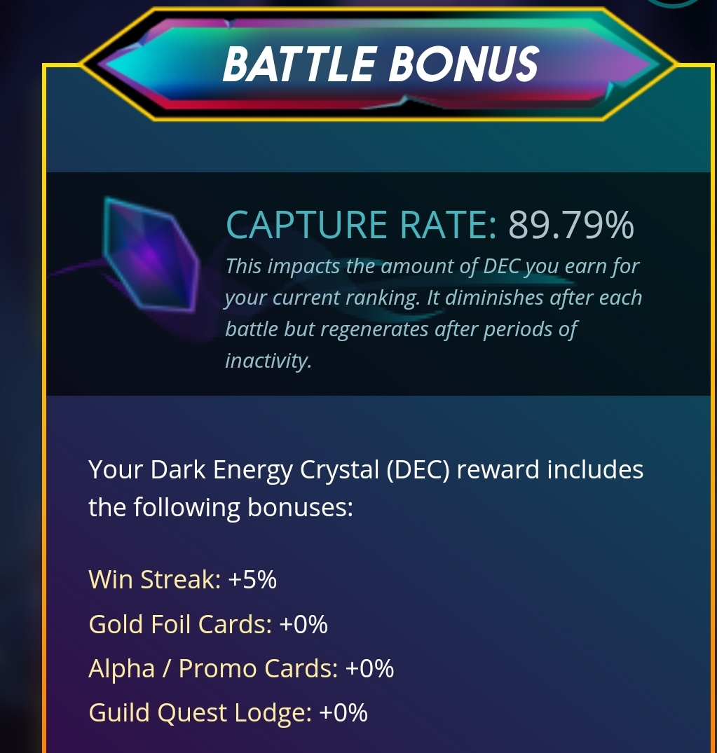 Mit jedem Kampf sinkt deine Energy Capture Rate, der auf den möglichen Gewinn angewendet wird und somit den Gewinn senkt. Wenn du wartest und nicht kämpfst lädt diese sich auf (quasi wie deine Votingpower). Sonst könnte man pausenlos Kämpfe bestreiten und sich DEC erkämpfen.