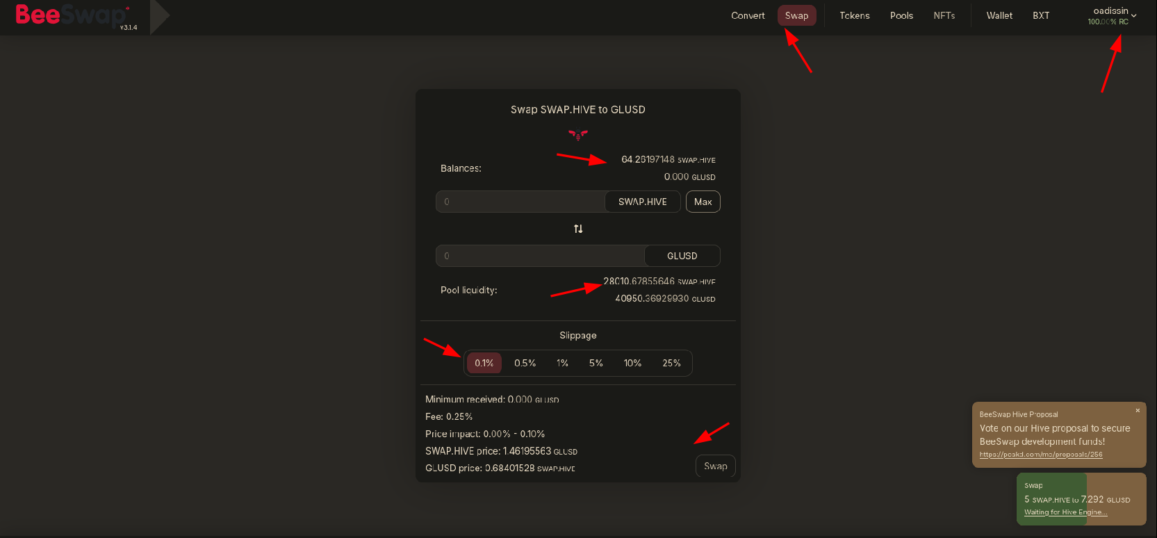 Do not hesitate to select the right pair in the pool area GLUSD and Swap.Hive. Check the balance of your wallet and the pool wallet for GLUSD to be sure you get the requested amount in the swap process.