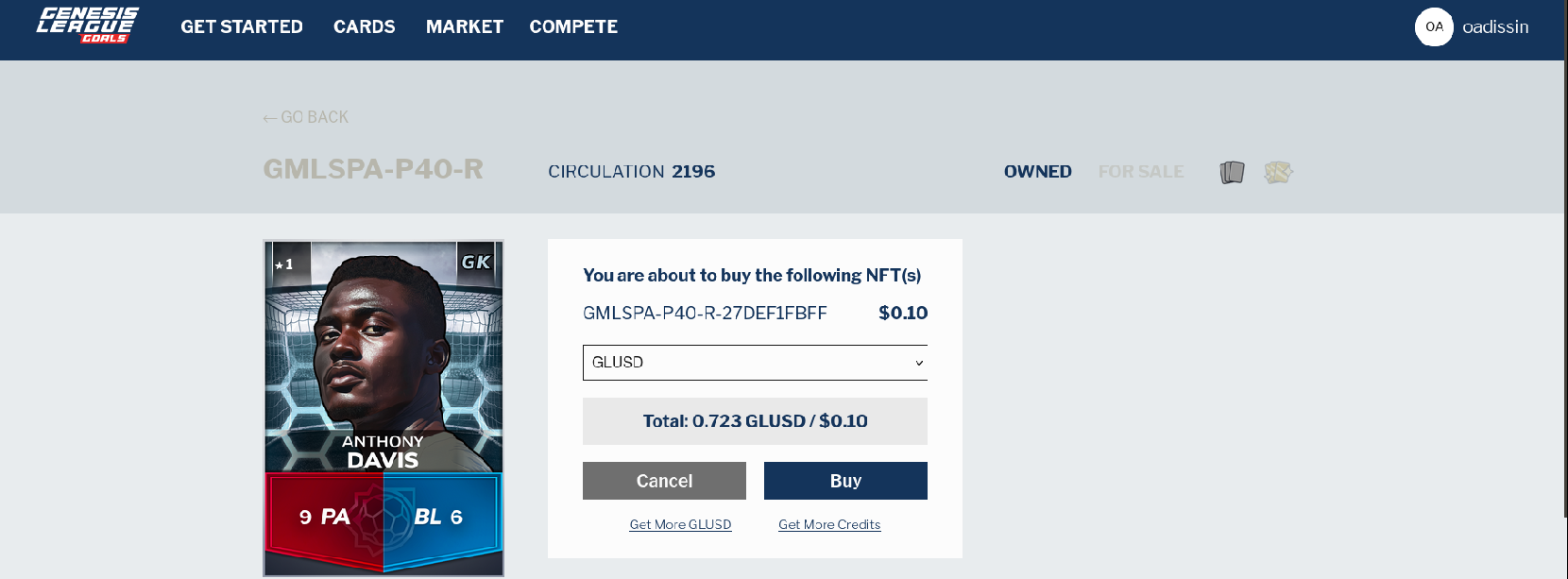 I went for Davis as a goal keeper. The moment I tried to buy this card I was asked to complete the purchase with GLUSD. It was crazy that I had around half a dollar available in my wallet.
