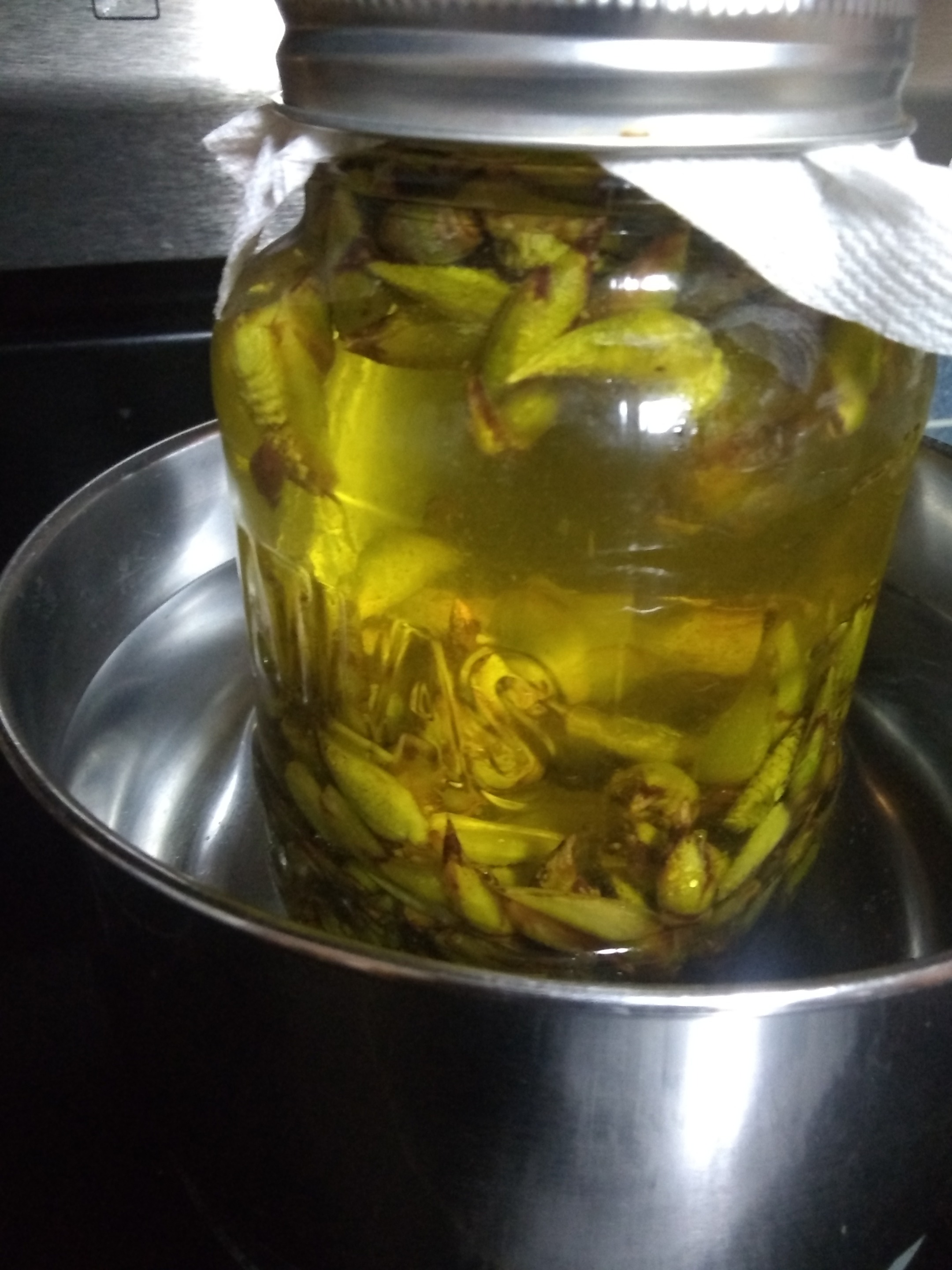 Half a jar of buds, fill the jar with oil. Soak in a small pan of water at 140°F (60°C) for five days or soak outside in the sun for six weeks to a year. I used coconut oil so as to make somewhat of a balm or salve.